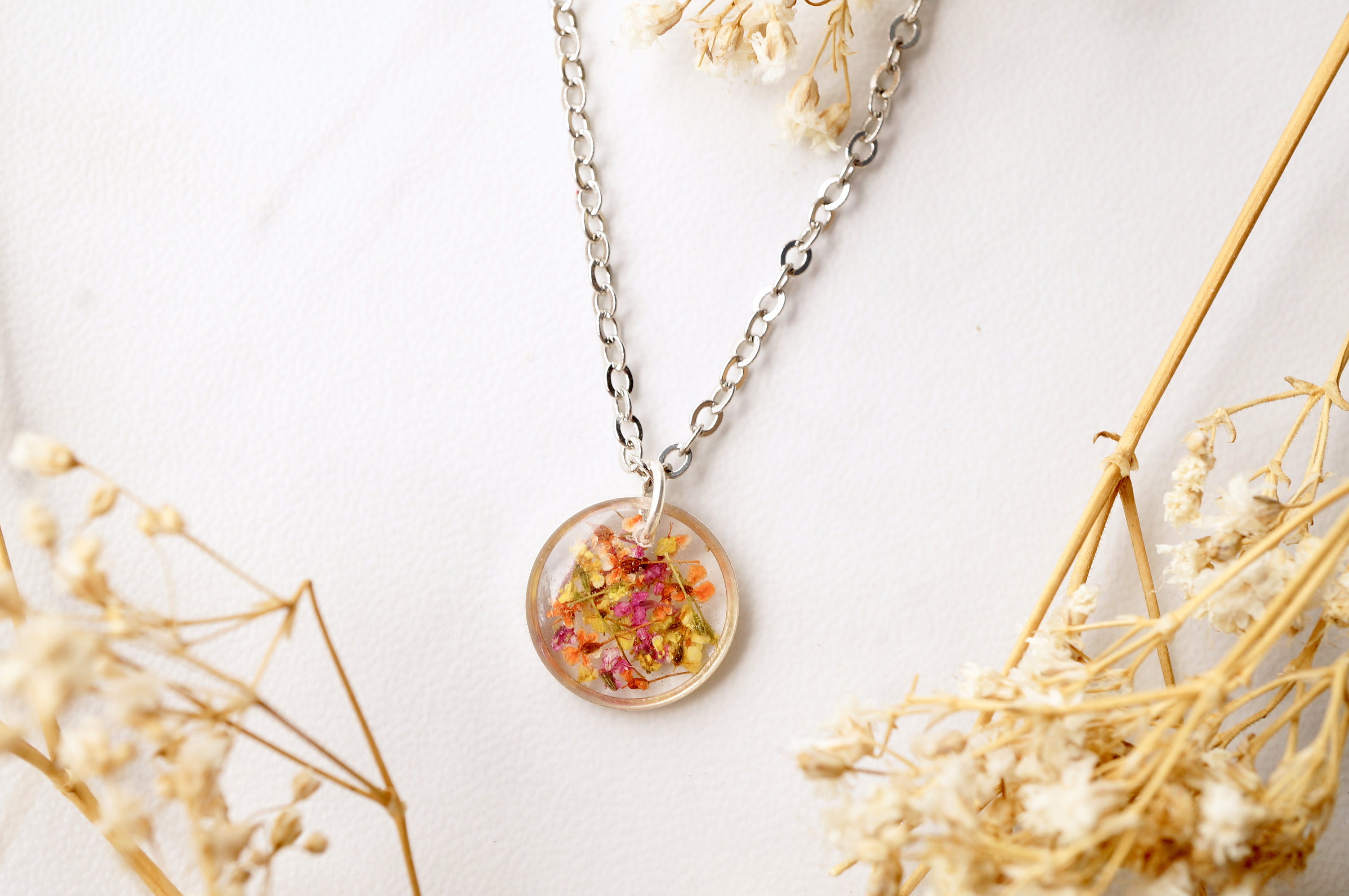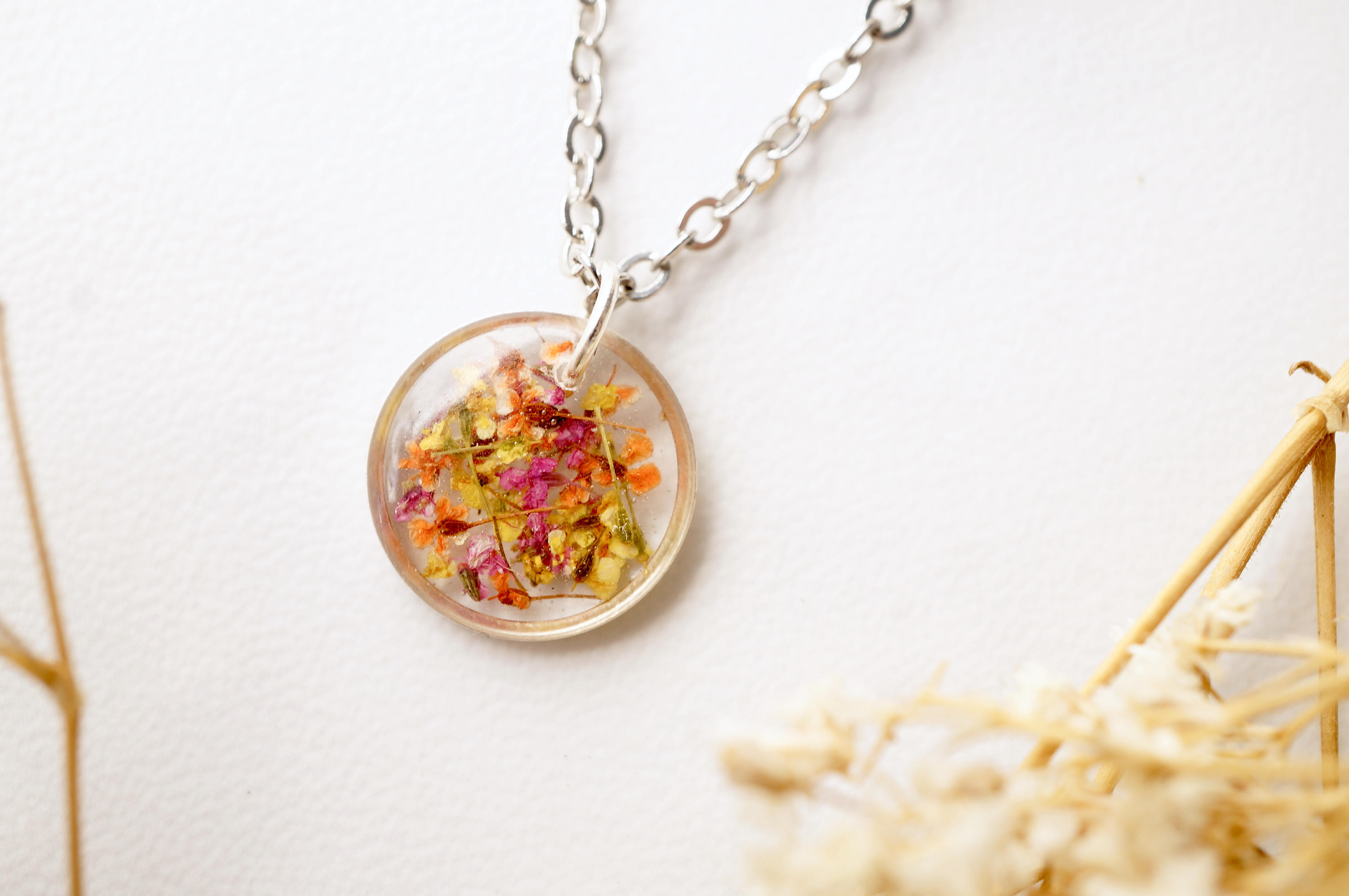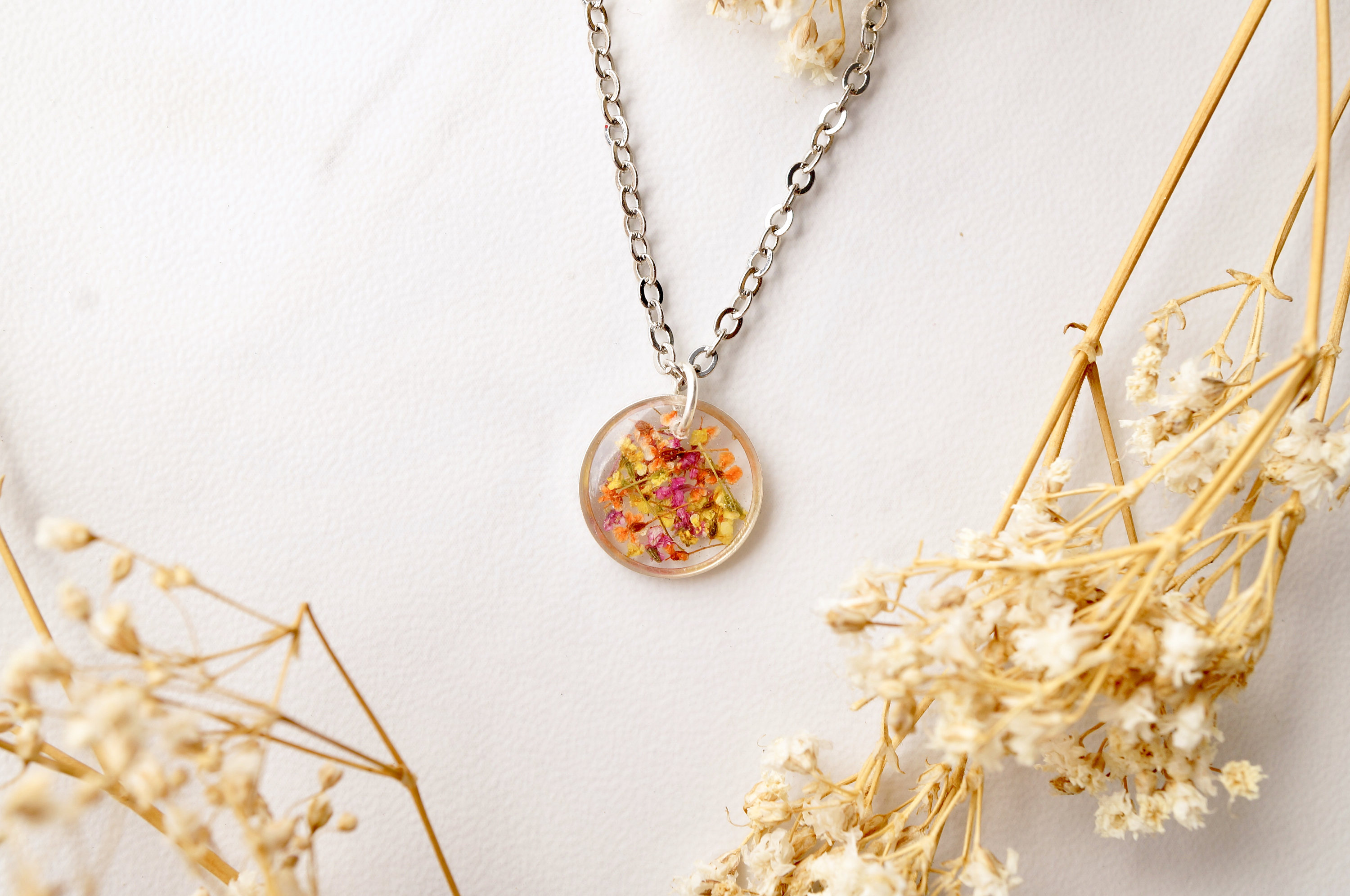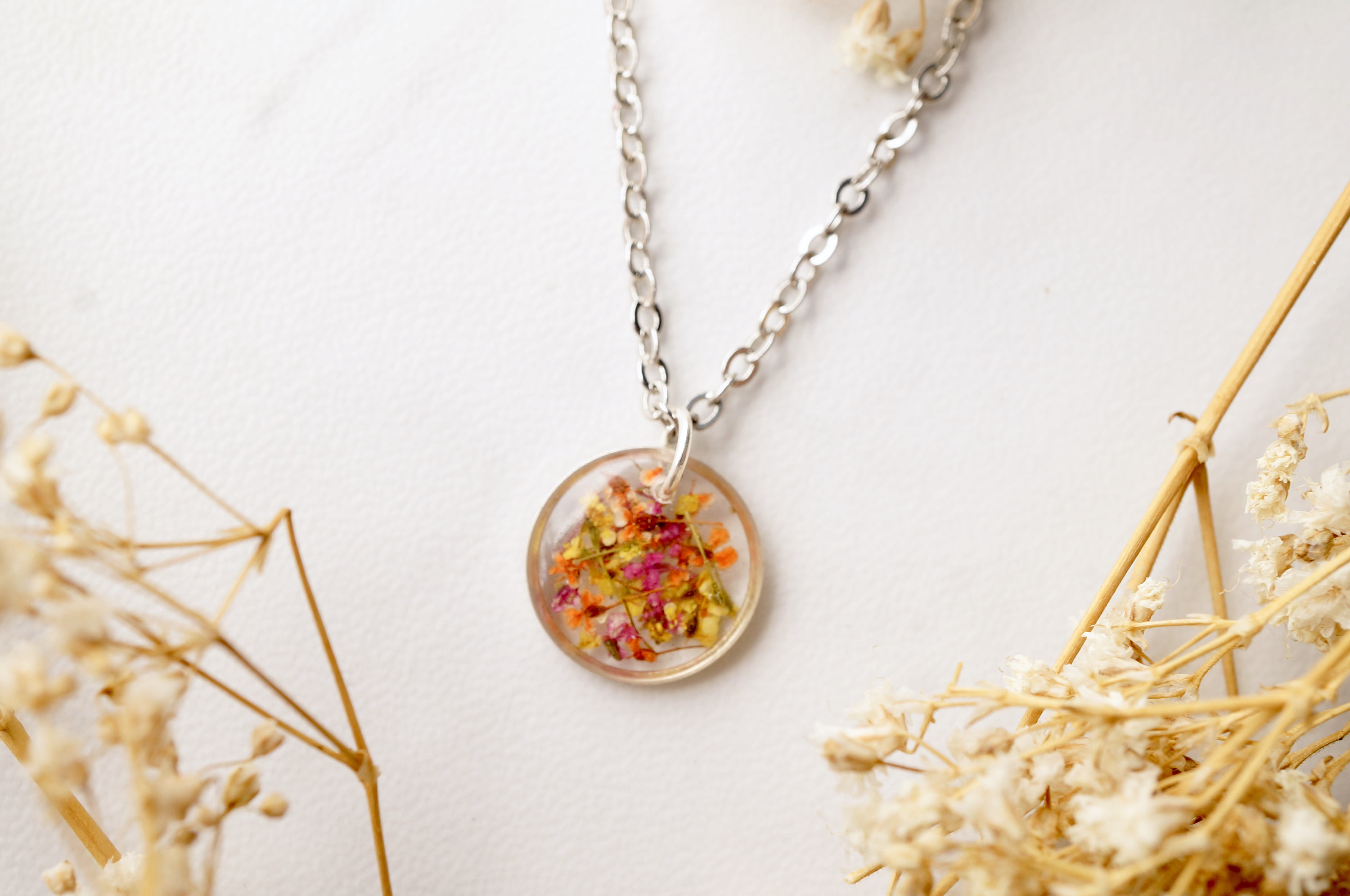 Real Dried Flowers in Resin Necklace, Small Silver Circle in Yellow Orange Red