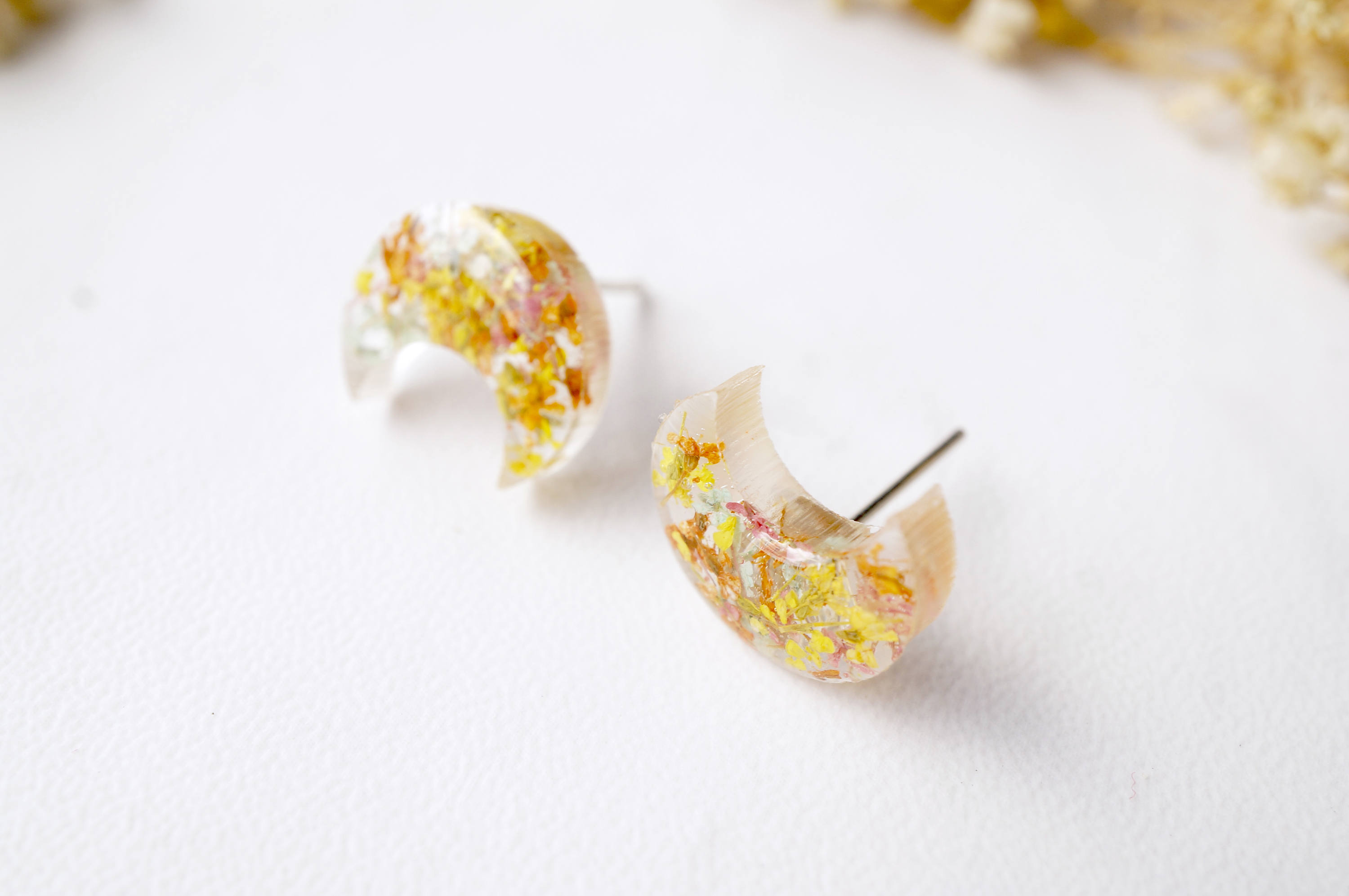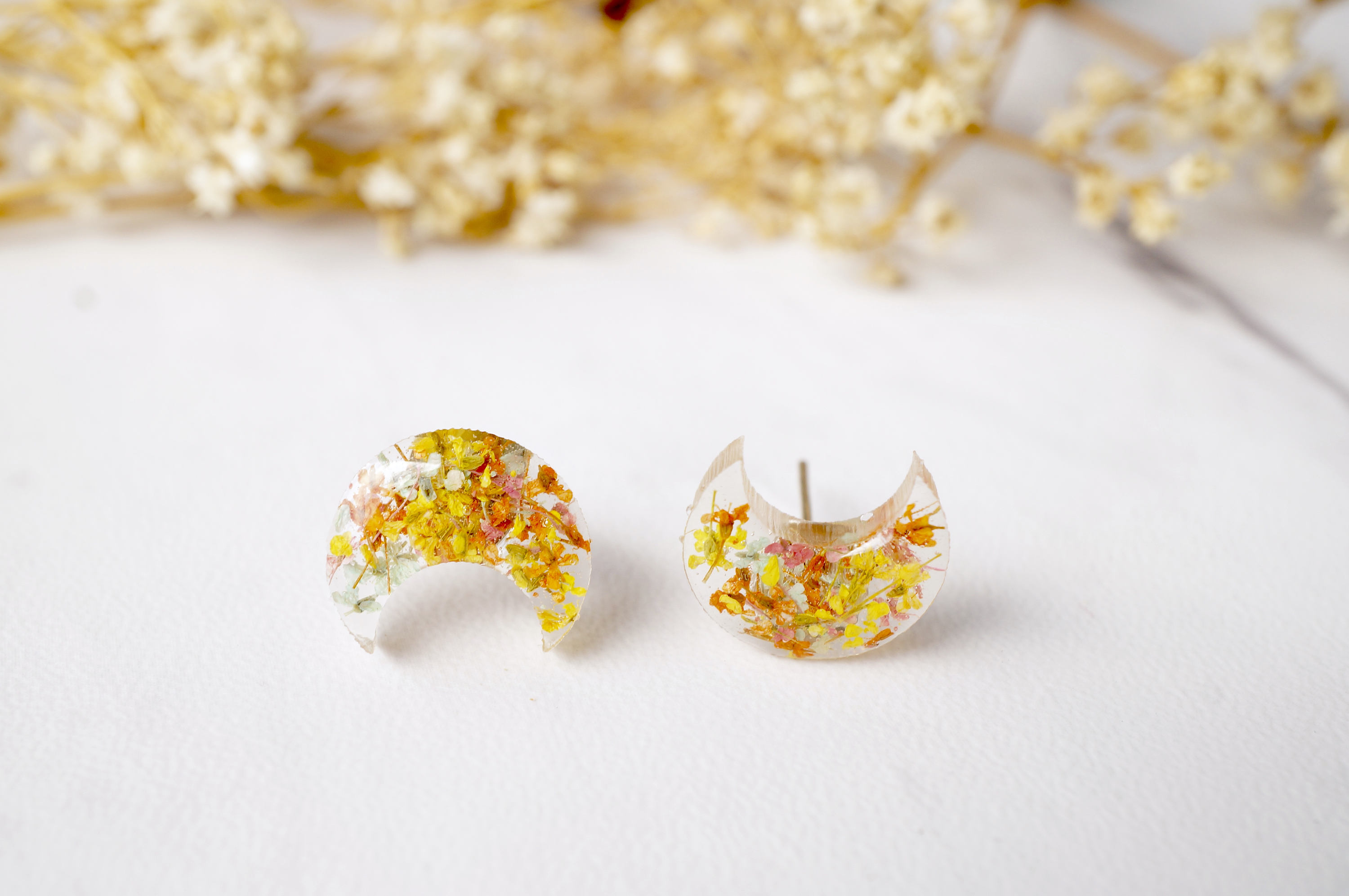 Real Dried Flowers and Resin Moon Stud Earrings in Yellow Orange Mint