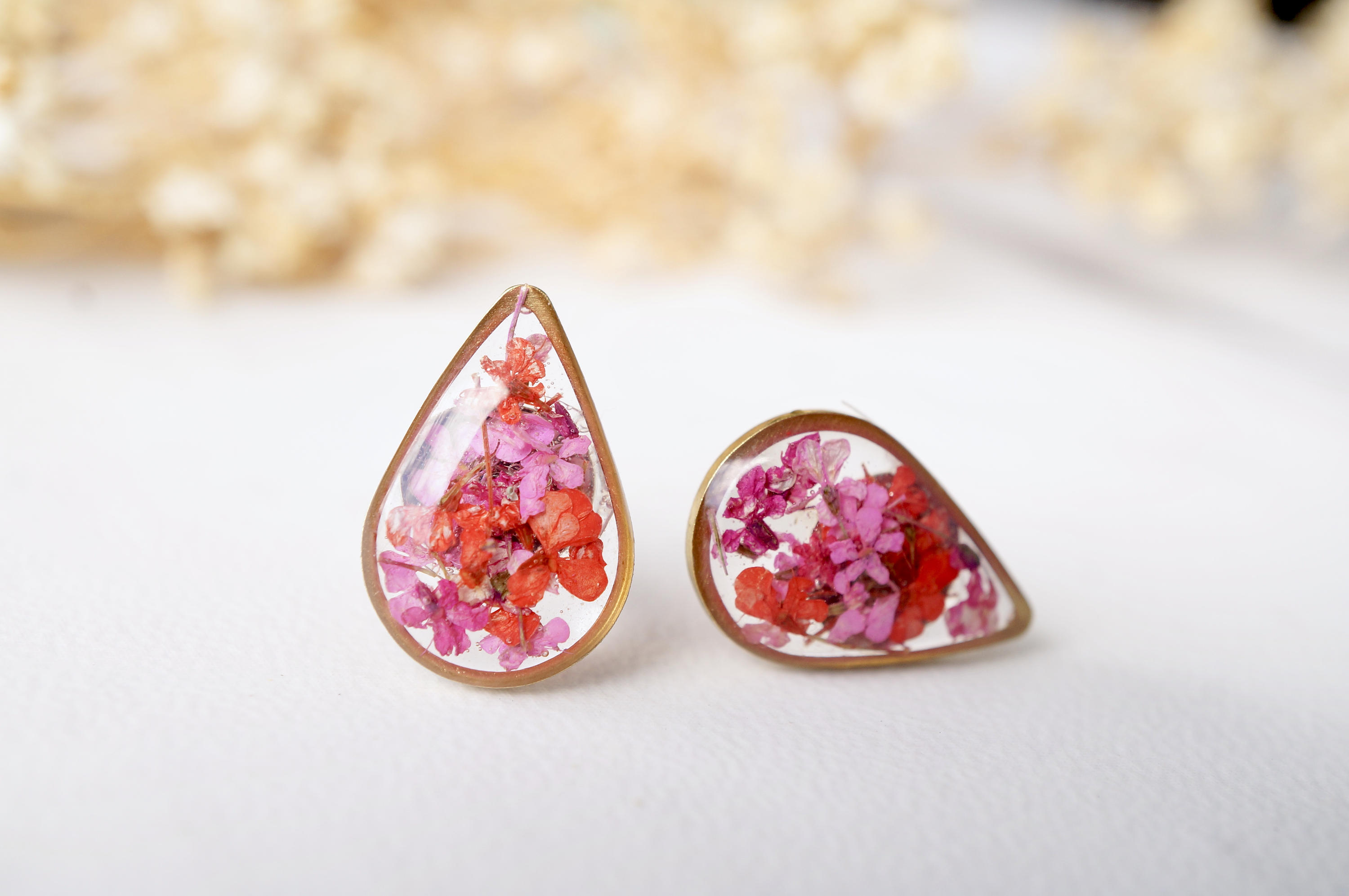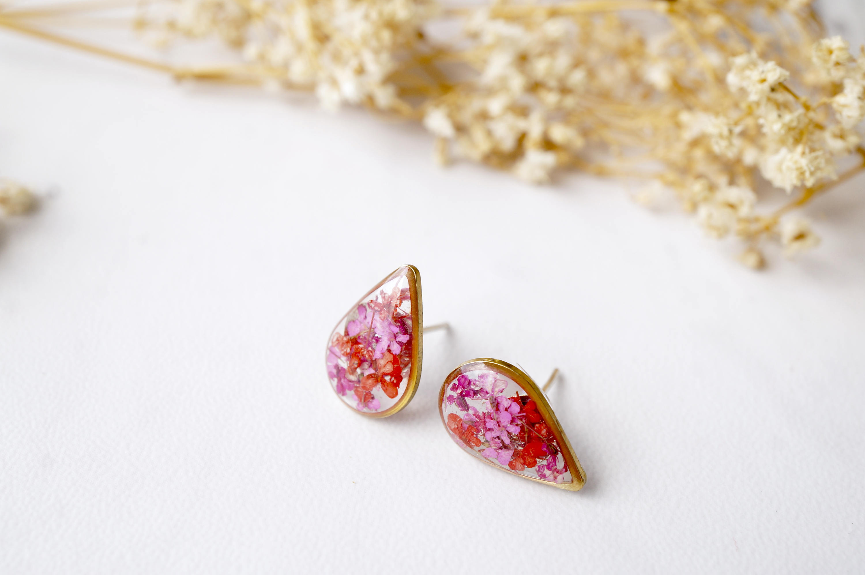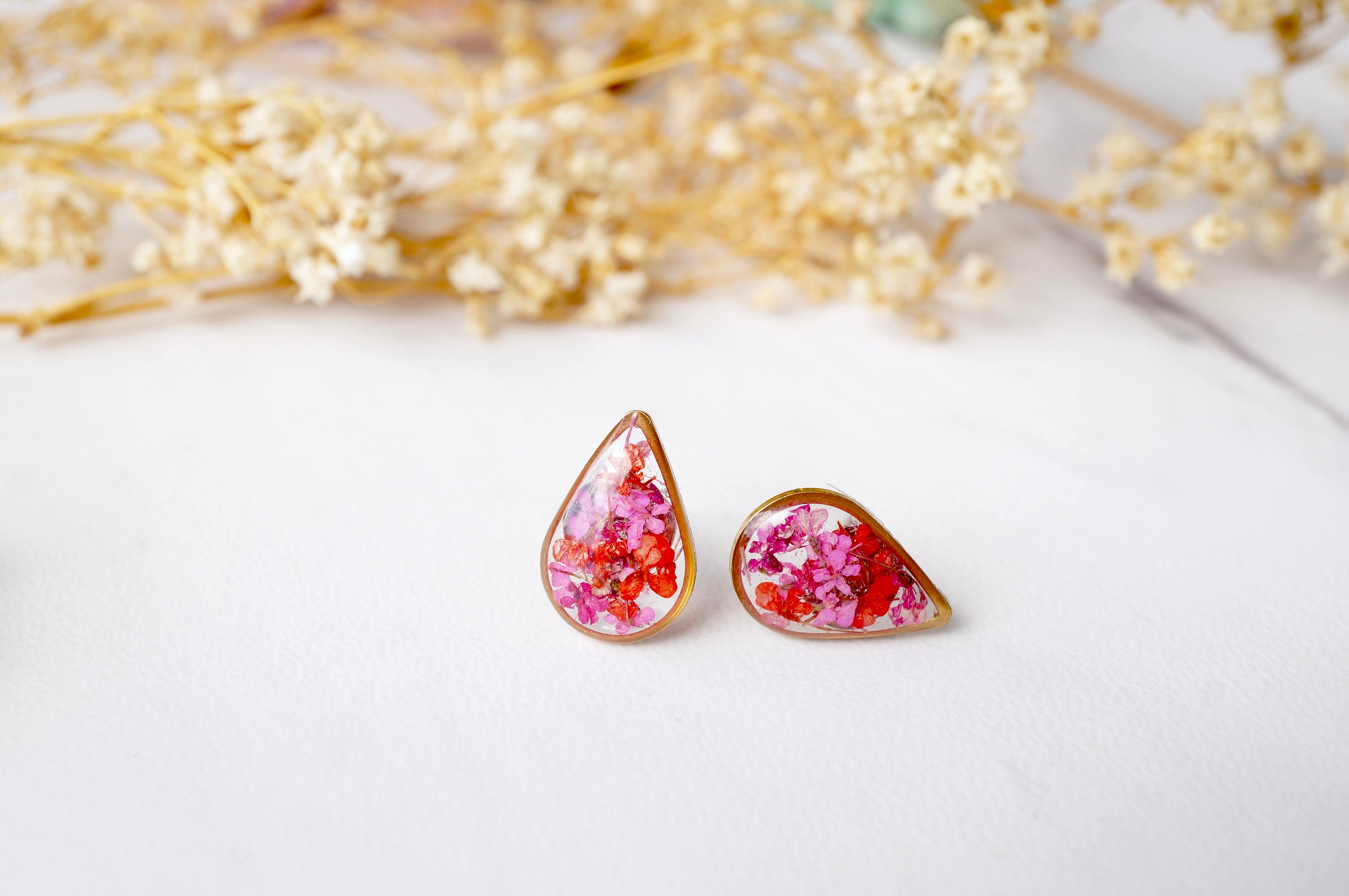 Real Dried Flowers and Resin Stud Earrings, Gold Teardrop in Red Pink Mix