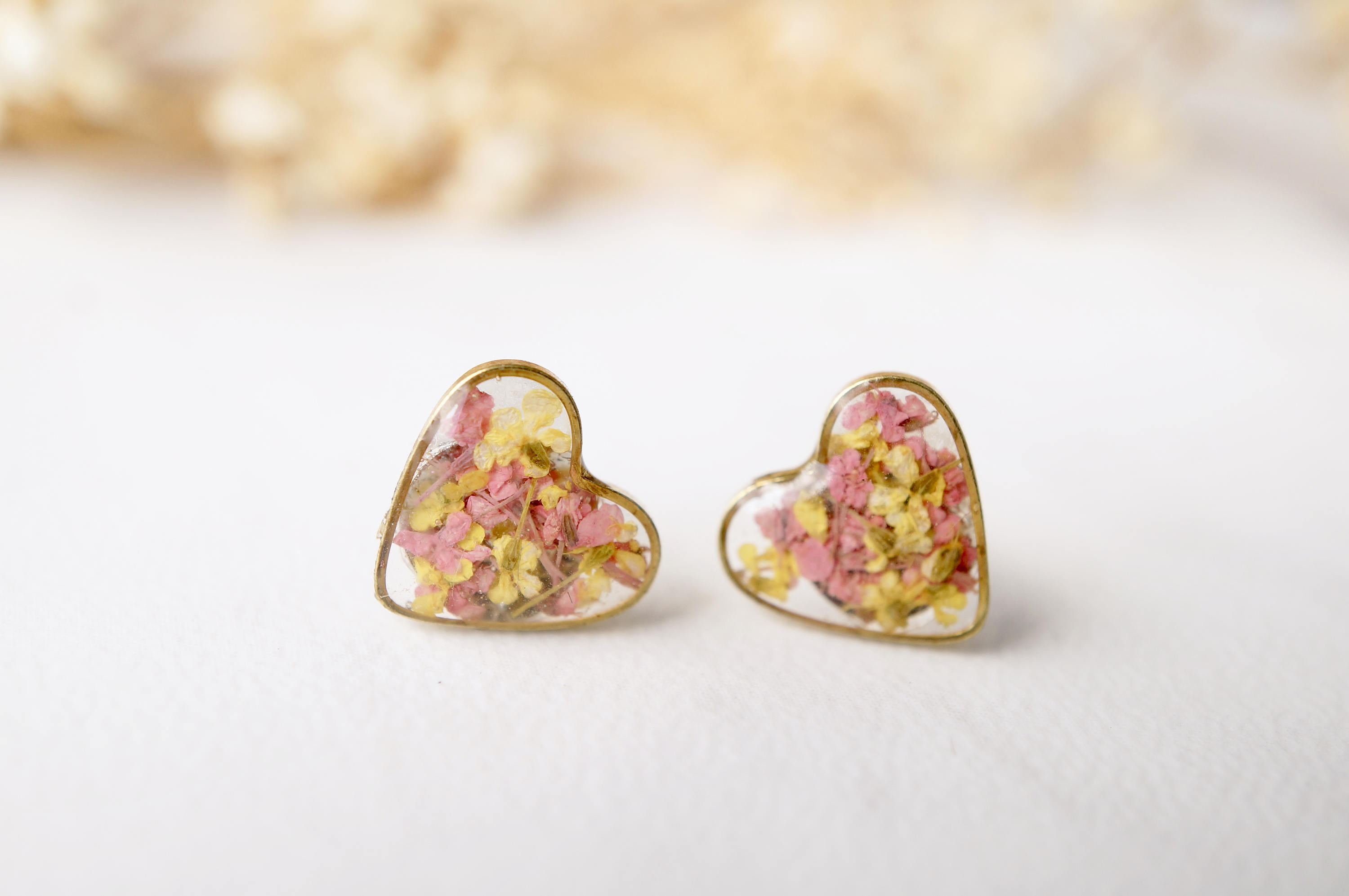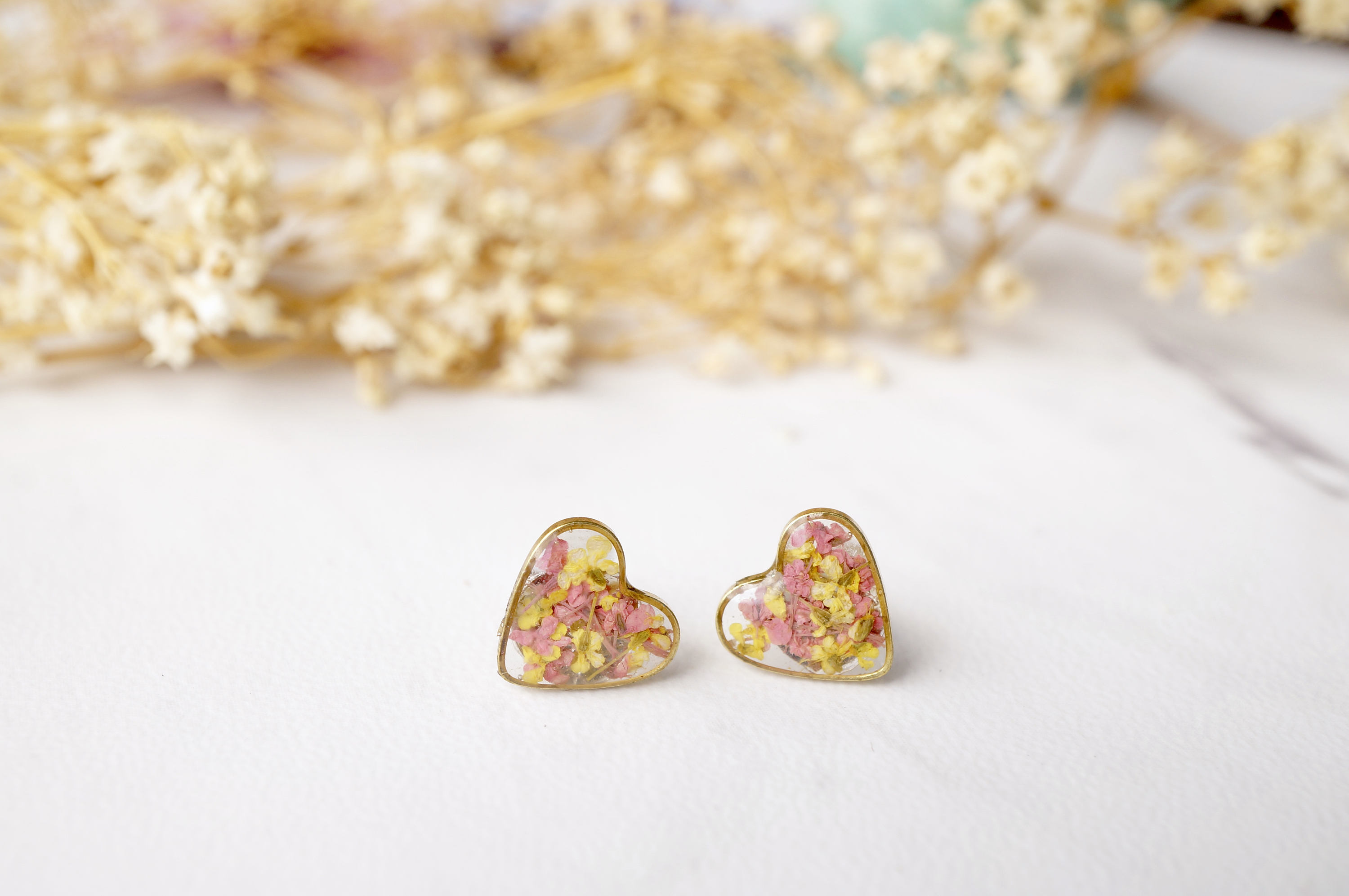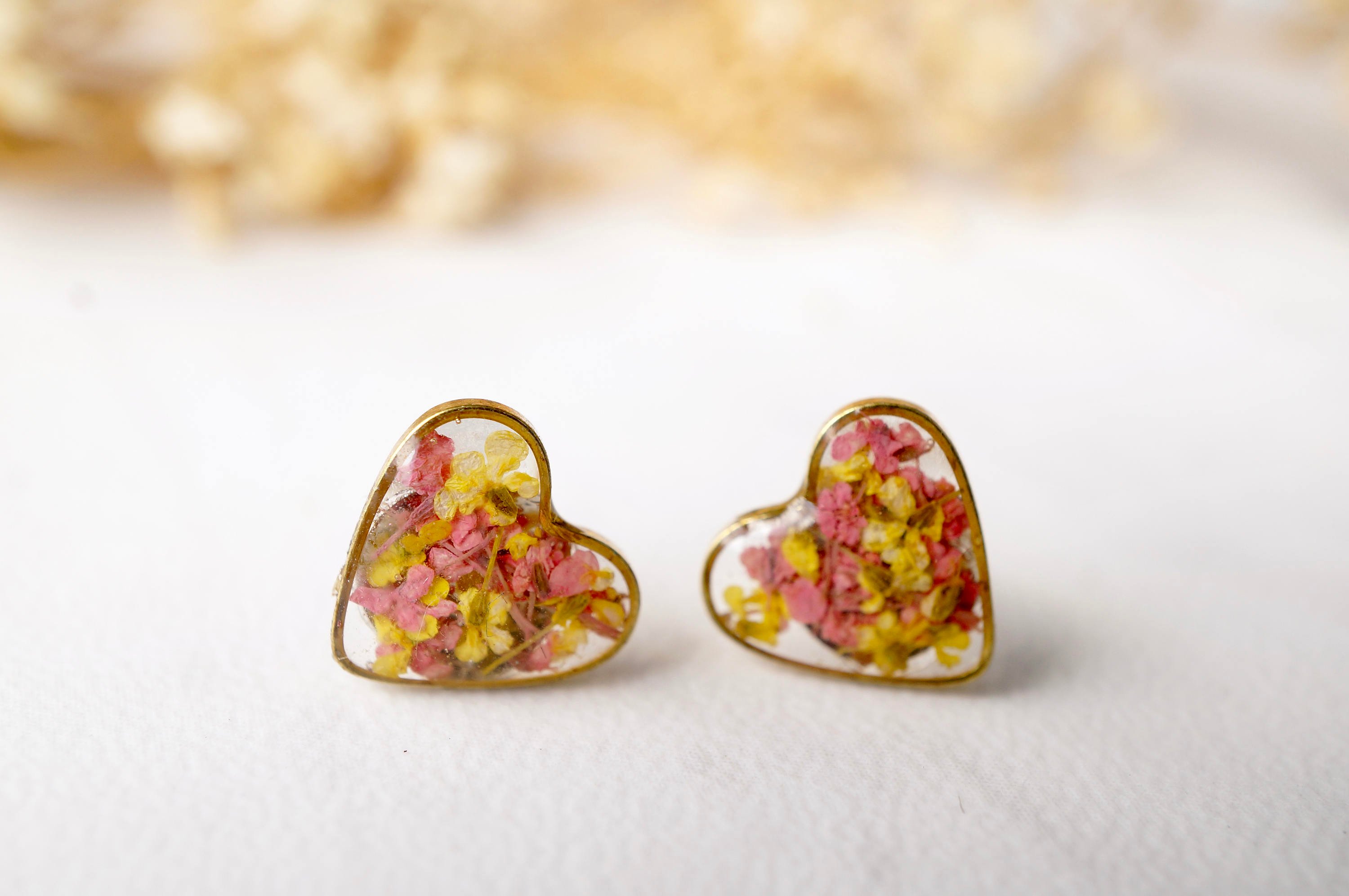 Real Dried Flowers and Resin Heart Stud Earrings in Pink and Yellow