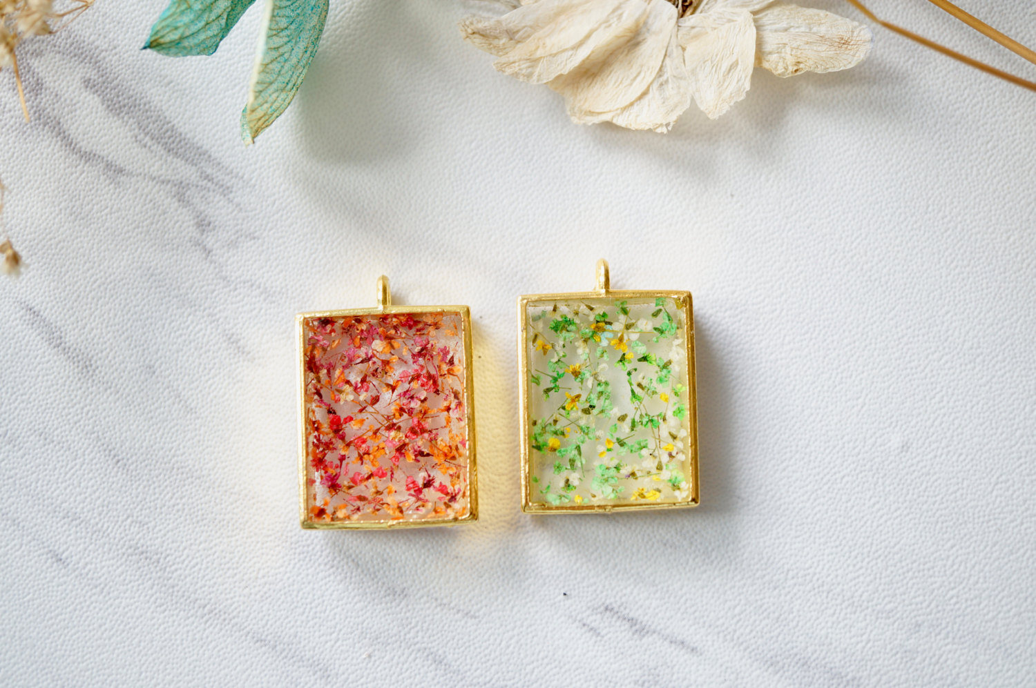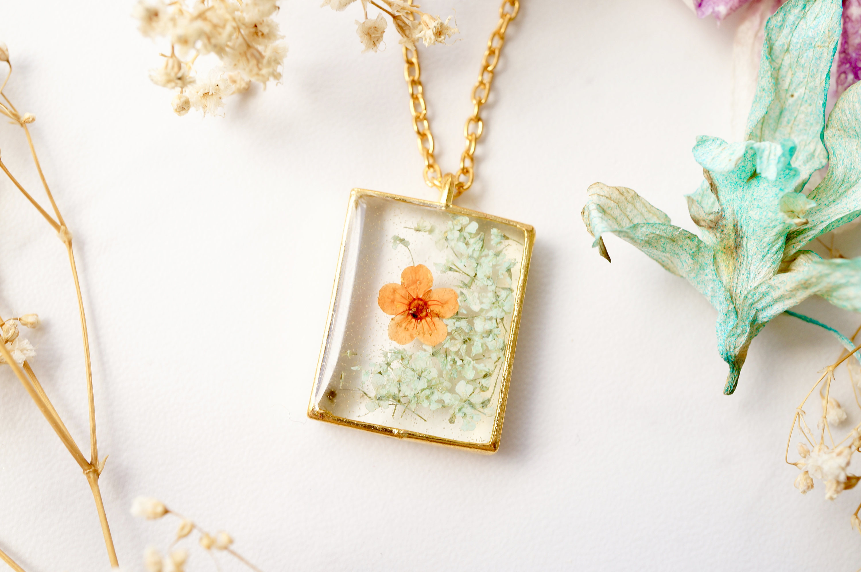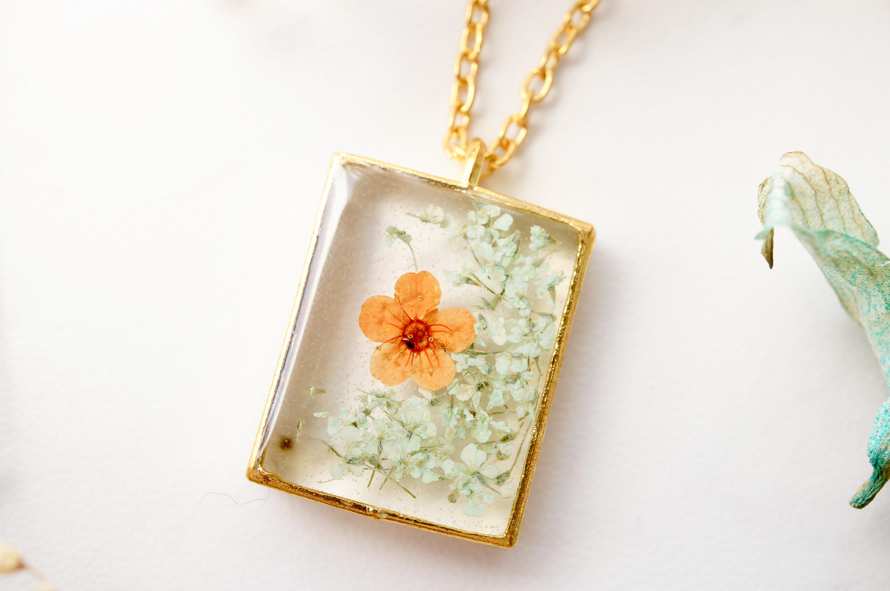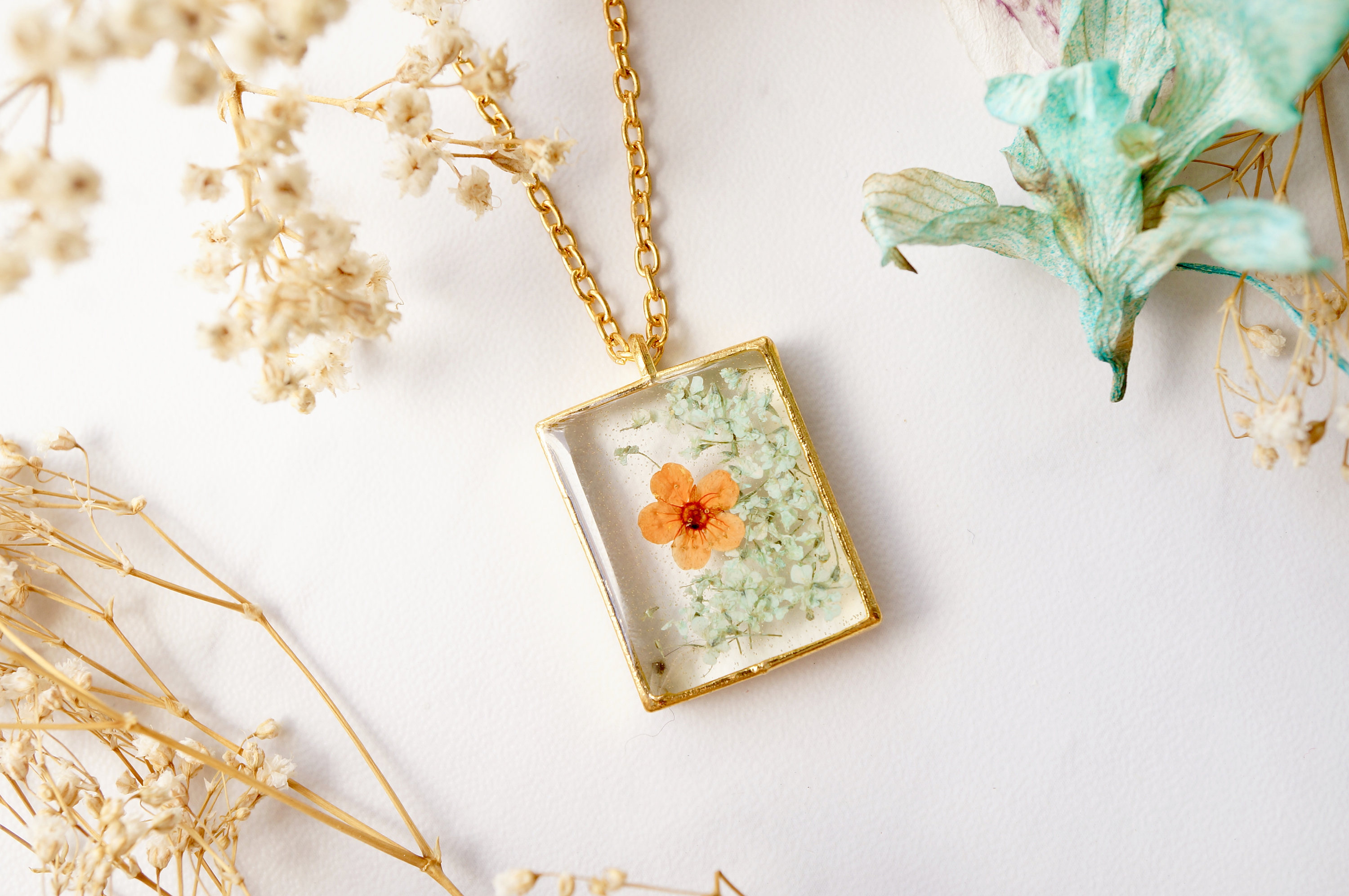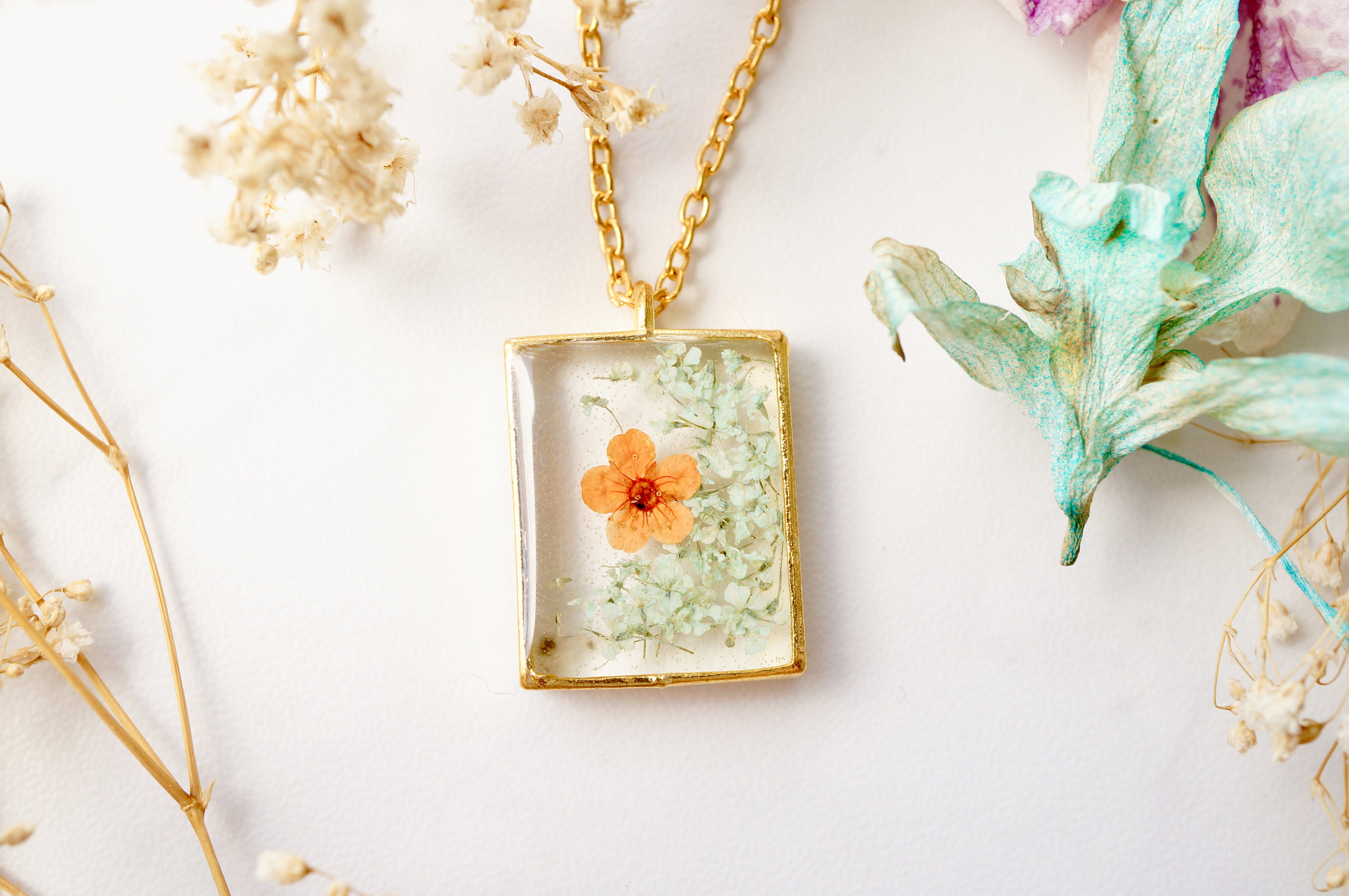 Real Dried Flowers in Resin Necklace, Gold Square in Mint and Orange