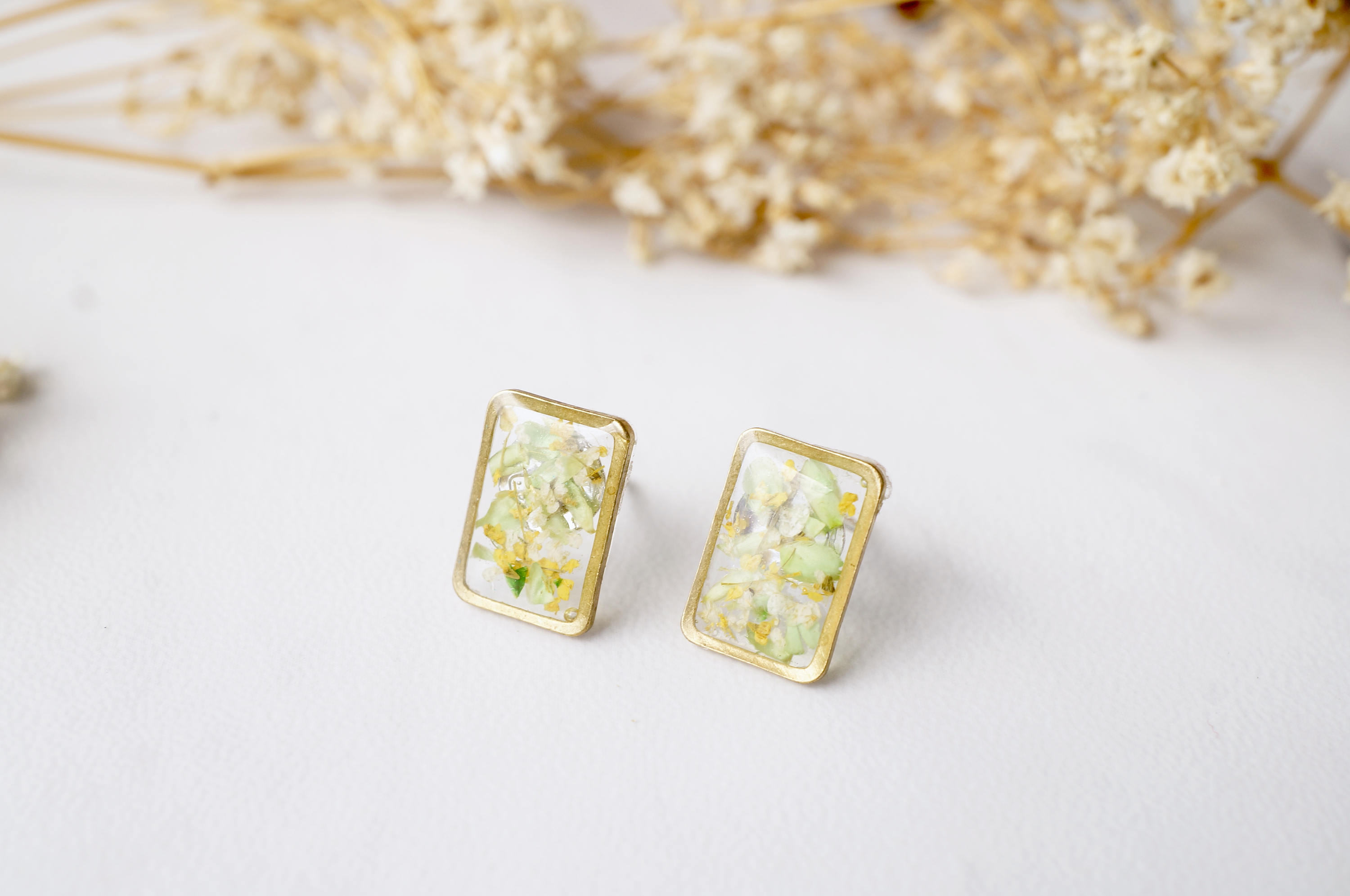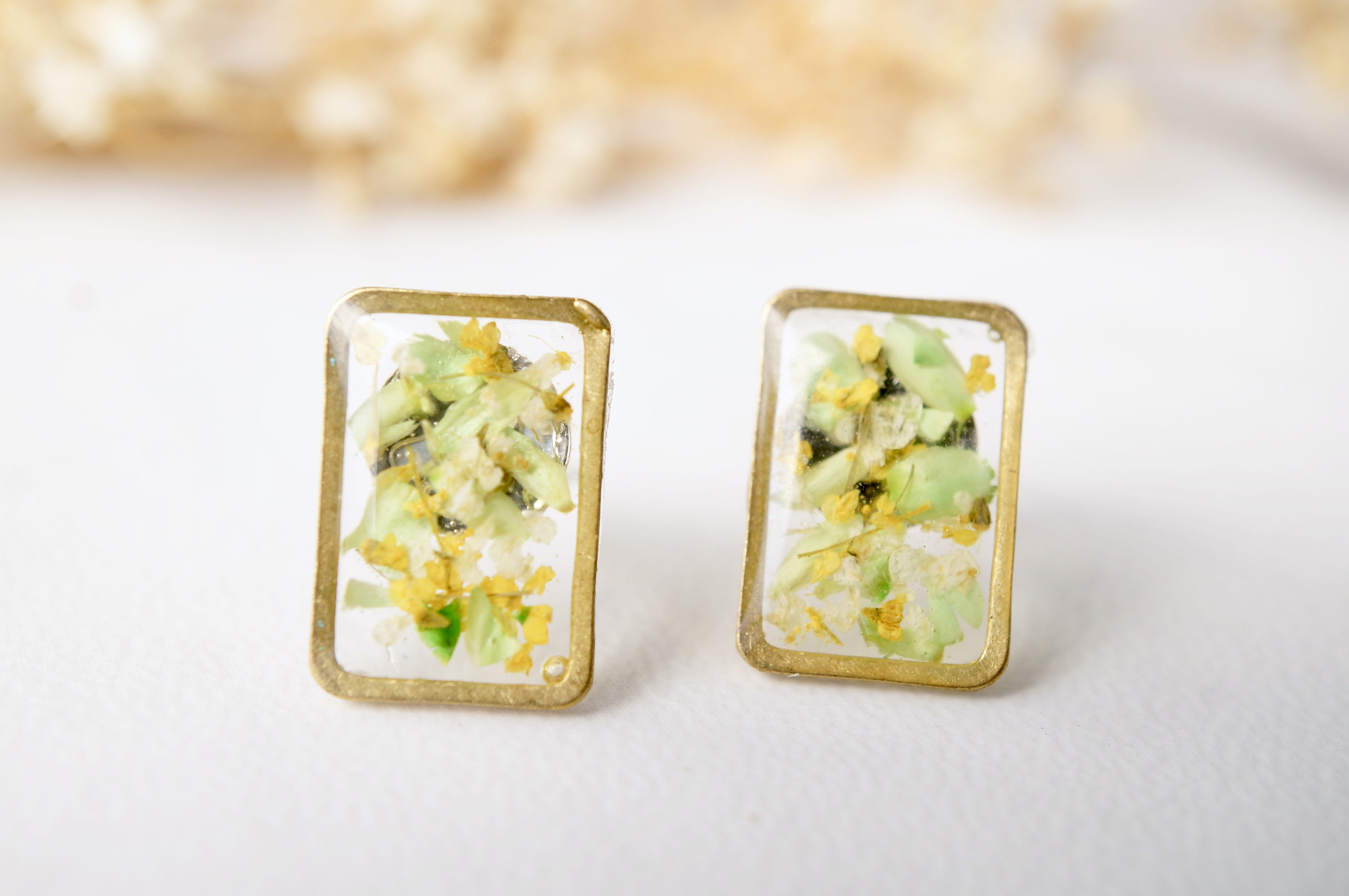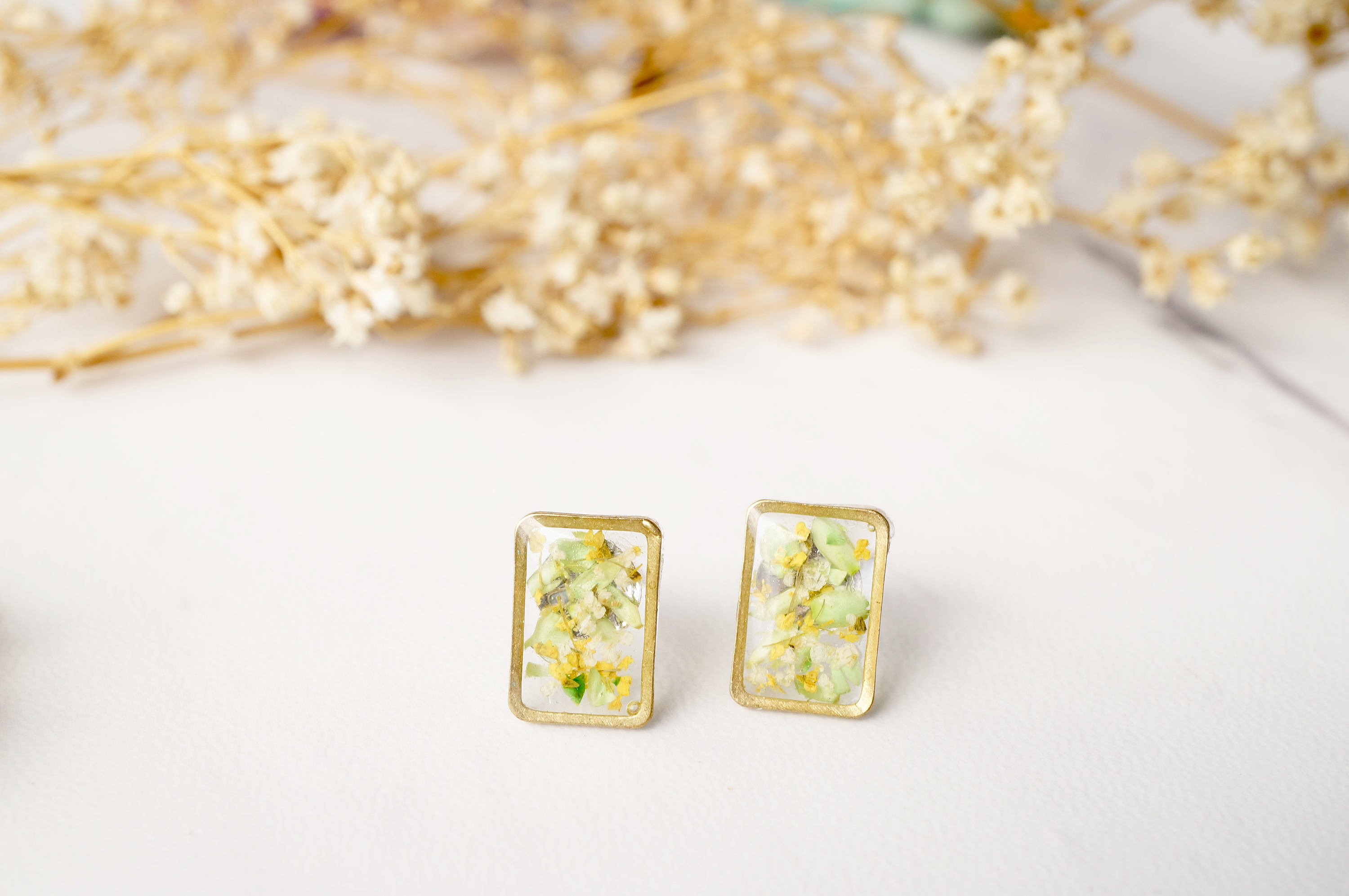 Real Dried Flowers and Resin Stud Earrings, Gold Rectangle in Yellow and Green