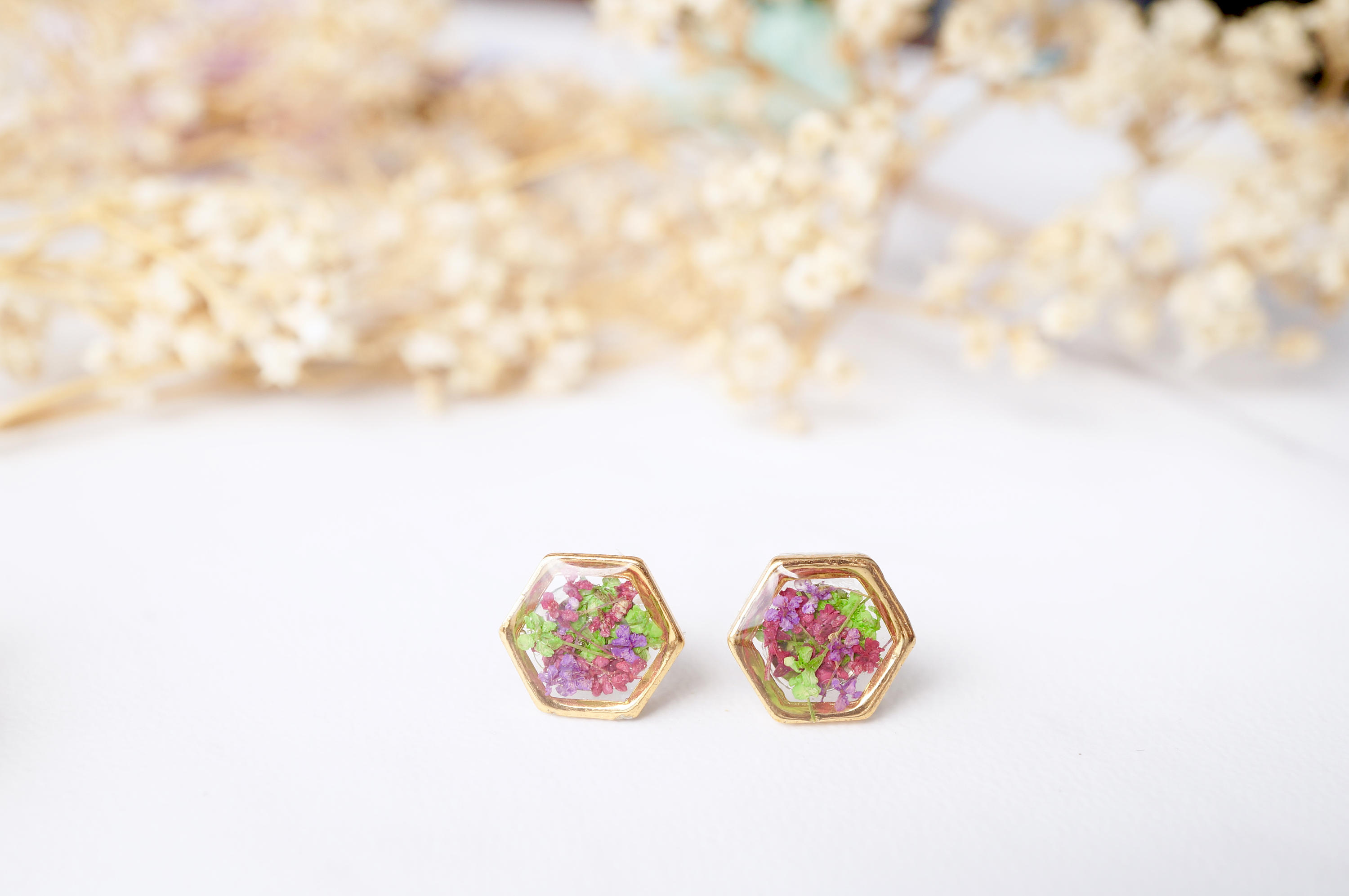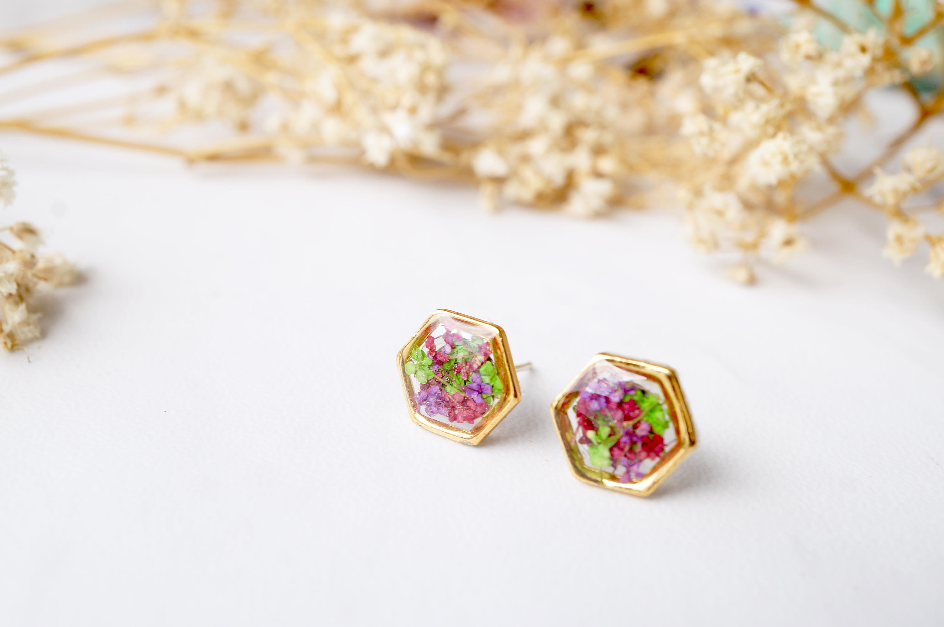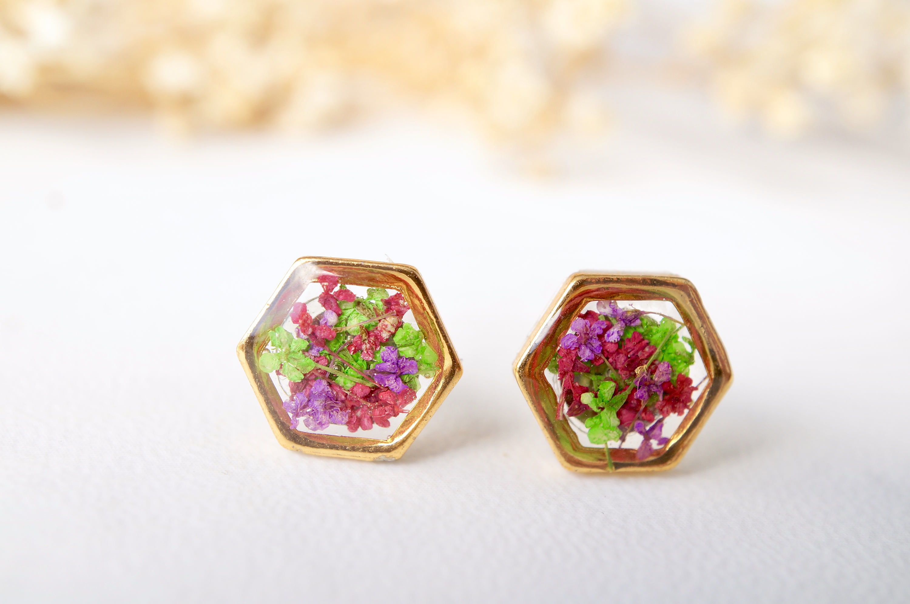 Real Dried Flowers and Resin Stud Earrings, Gold Hexagon in Red Purple Green