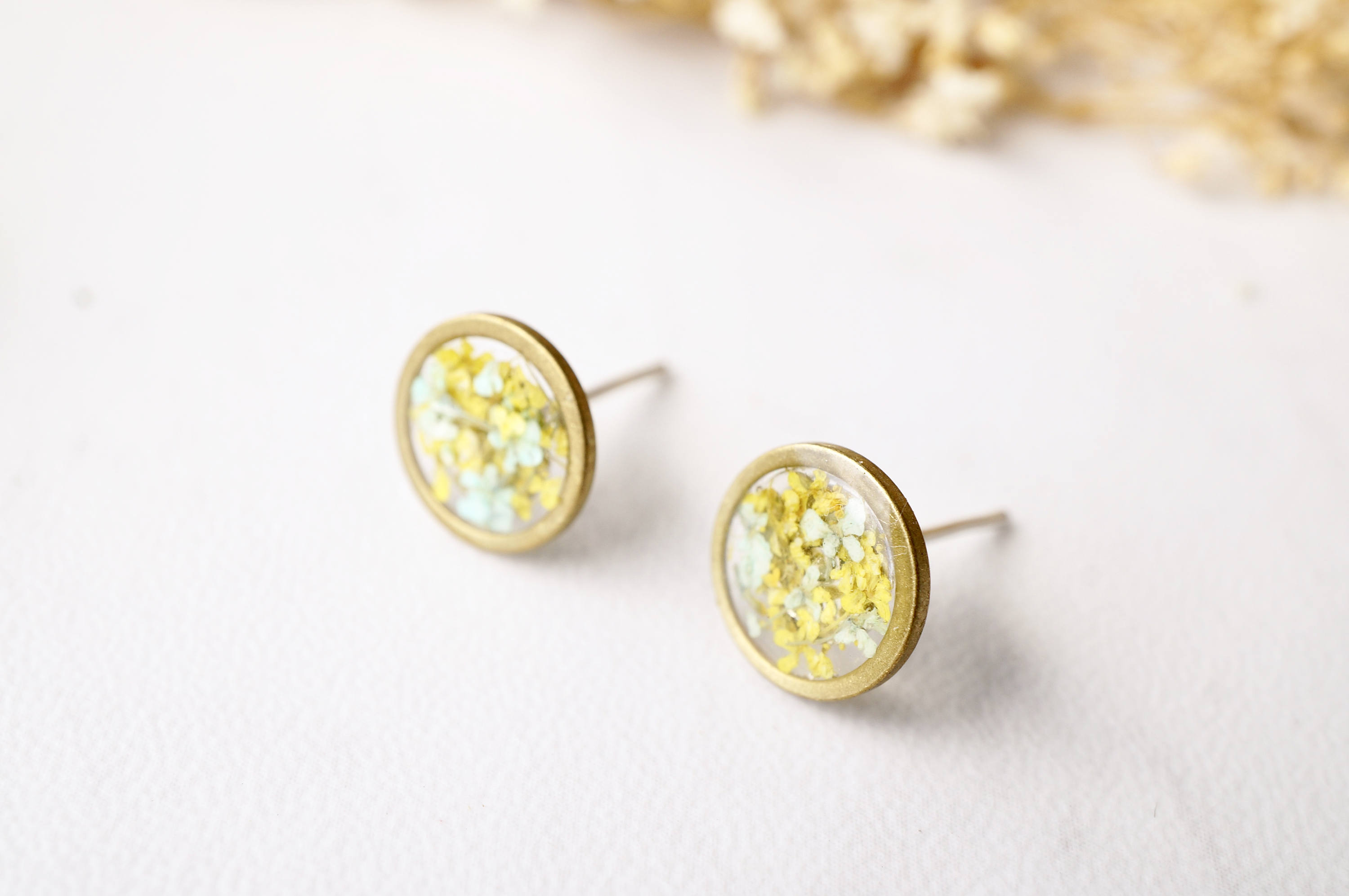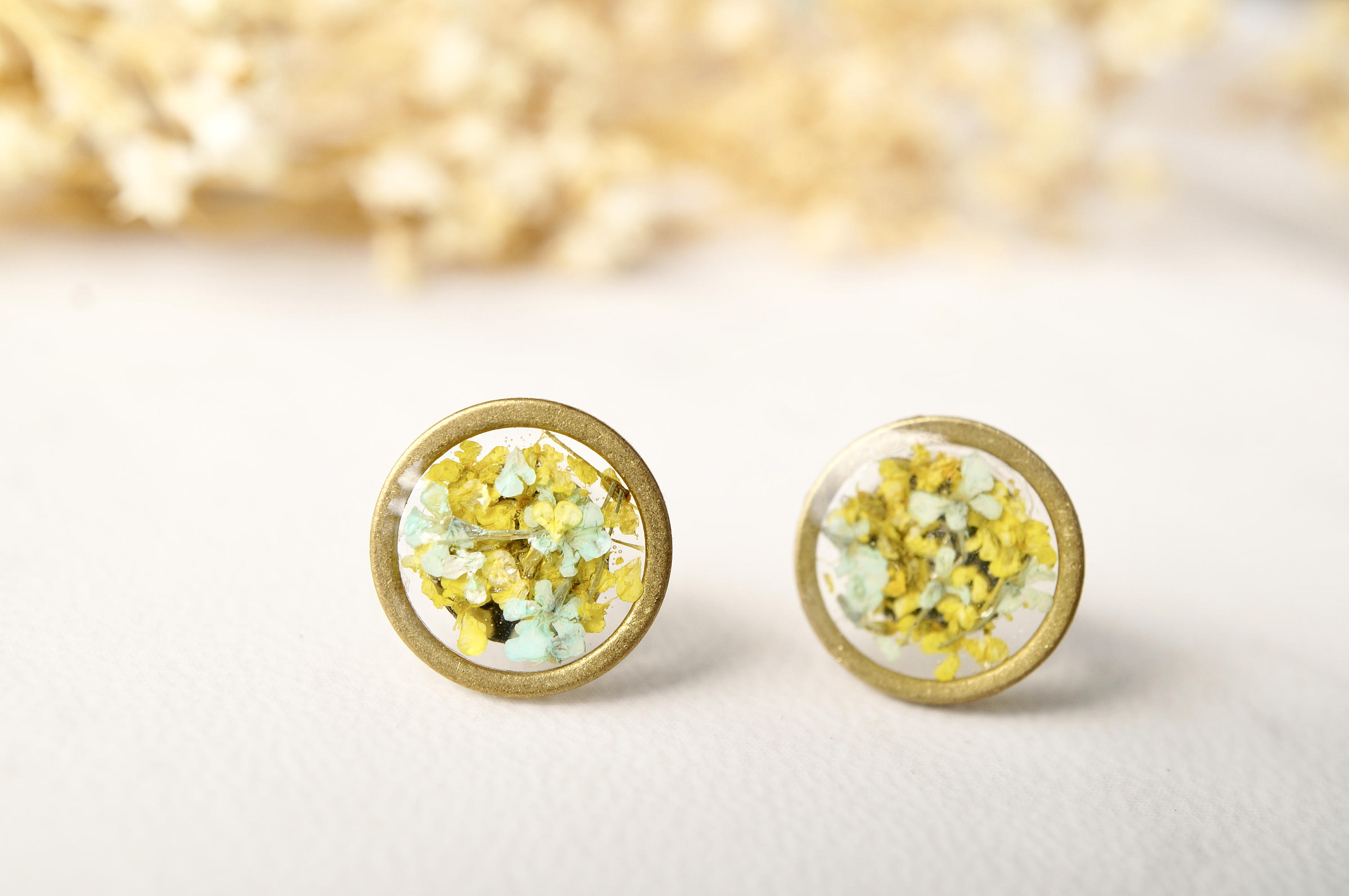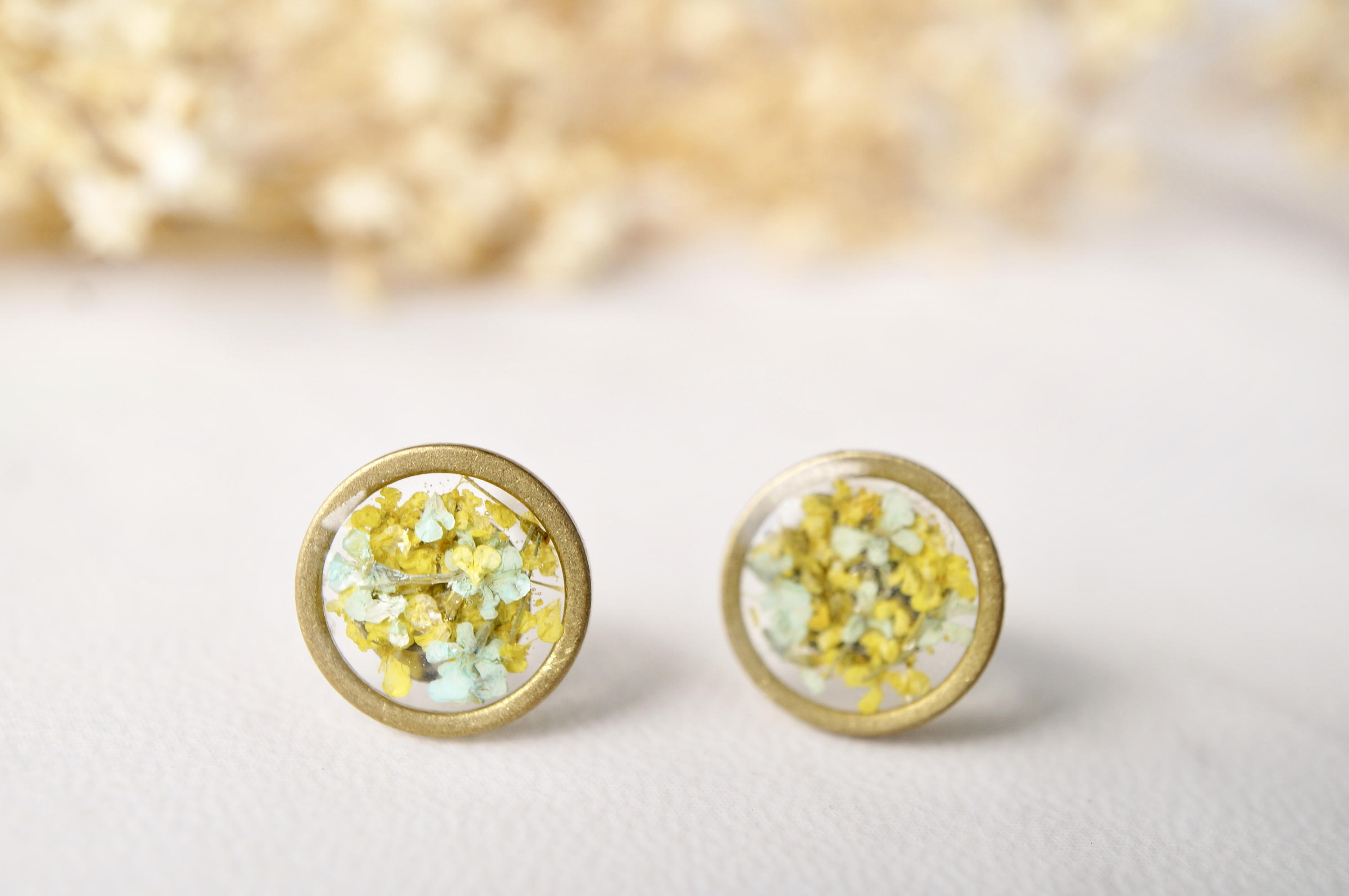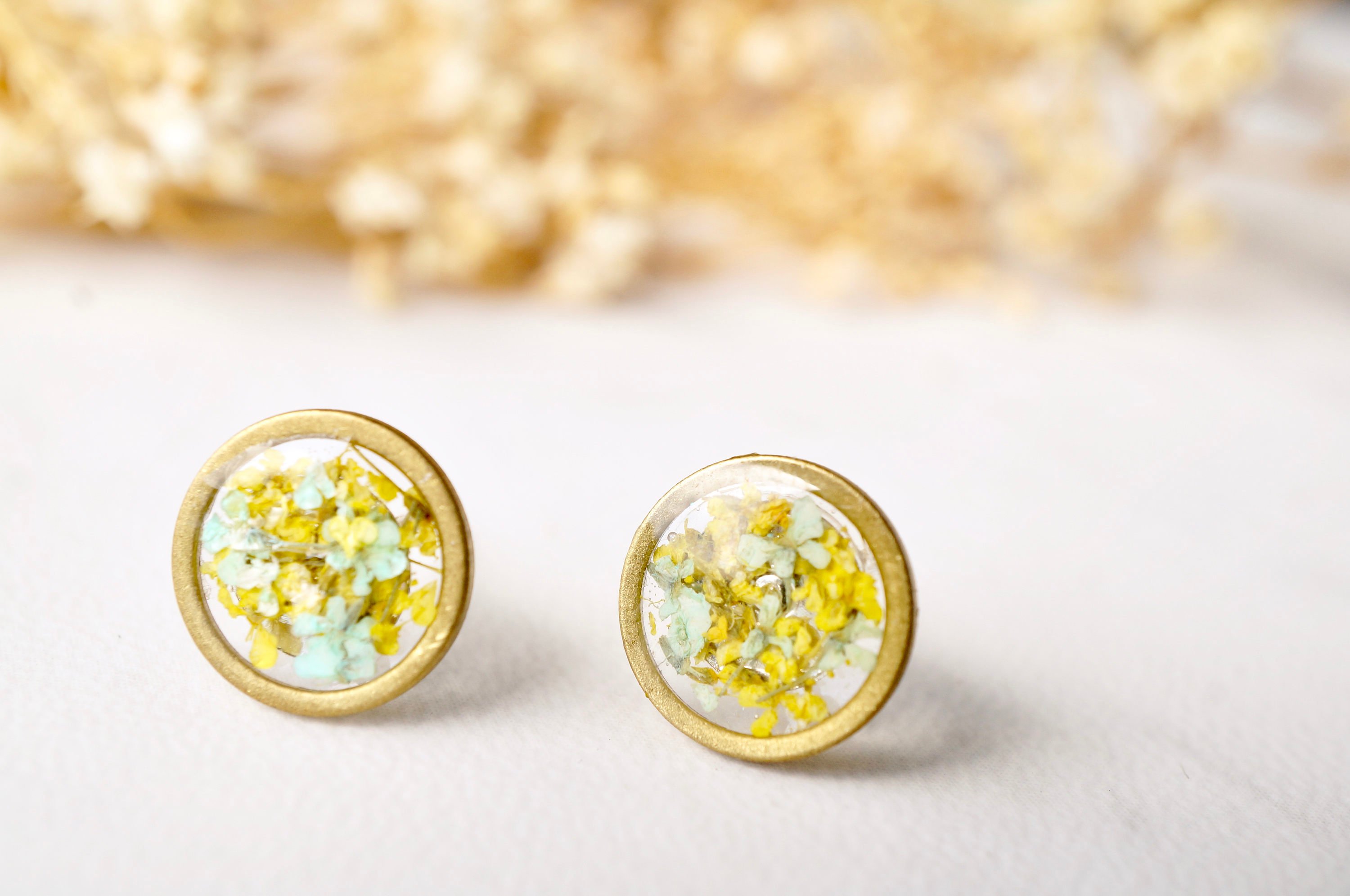 Real Dried Flowers and Resin Stud Earrings, Gold Circle in Mint and Yellow