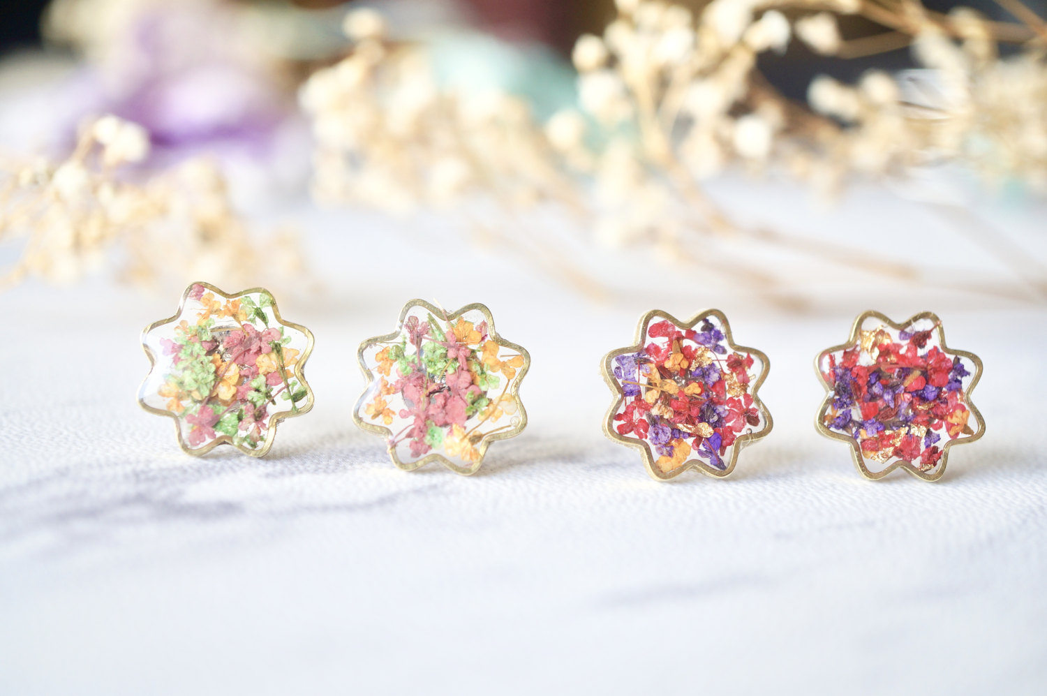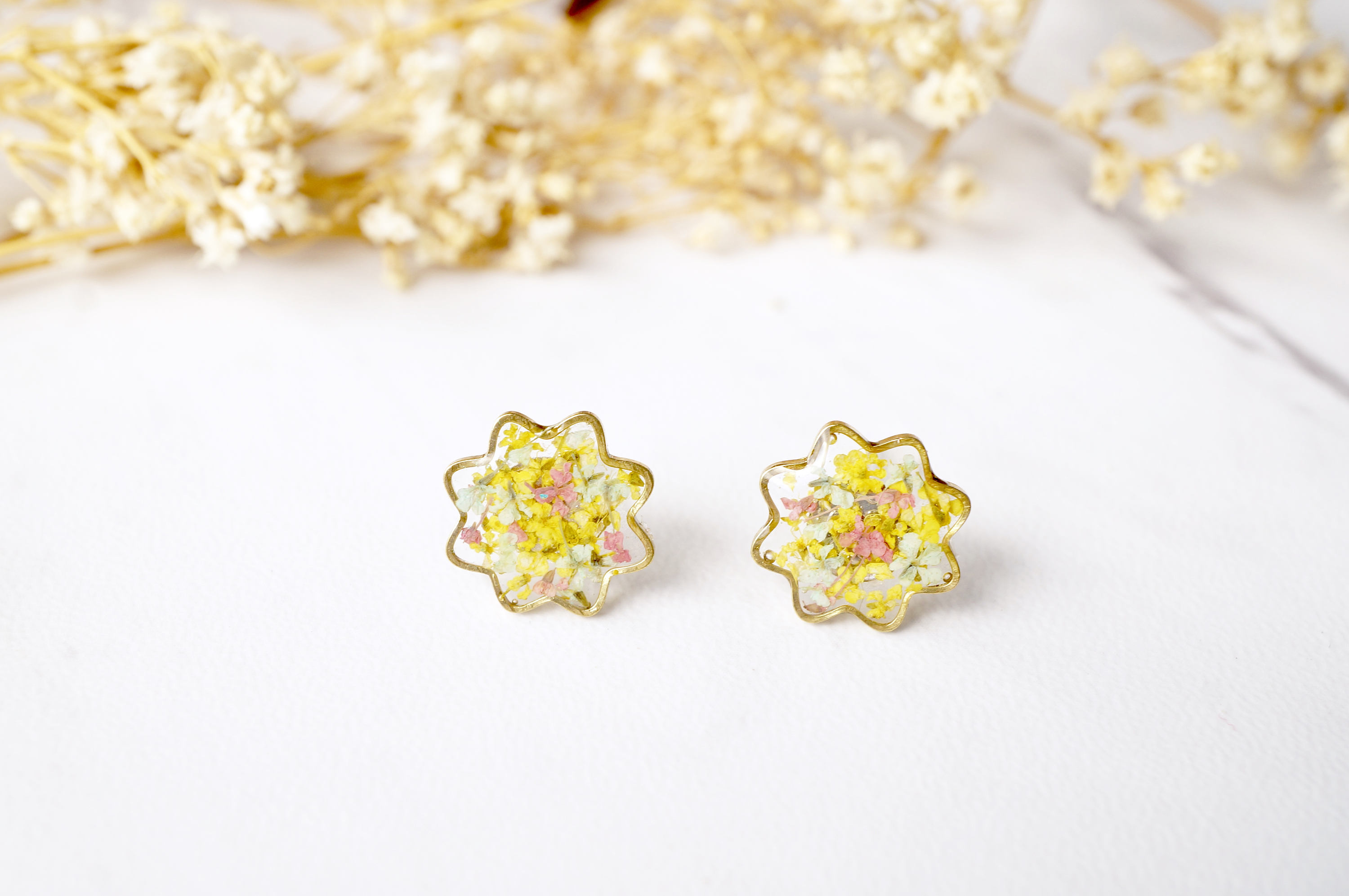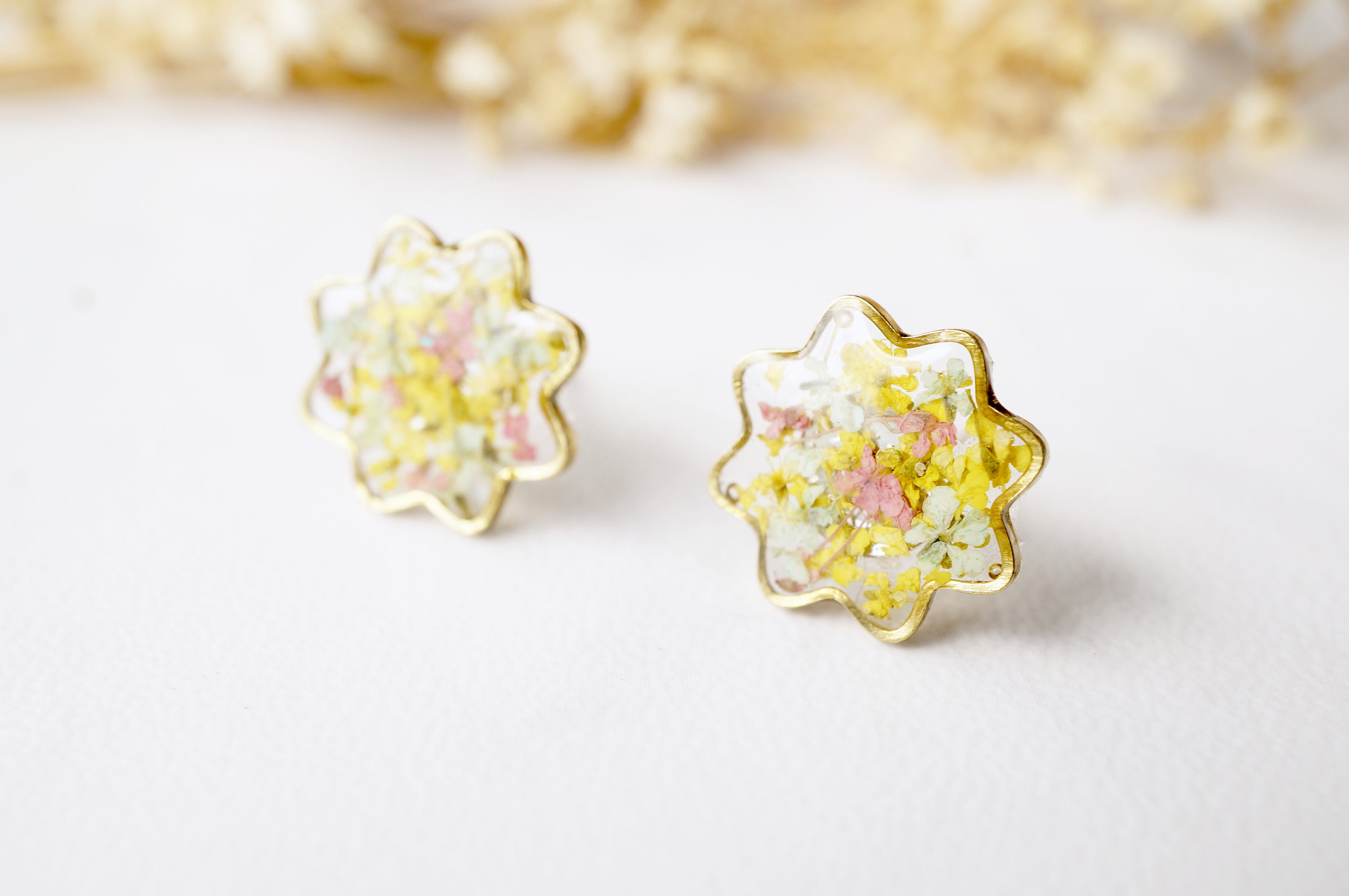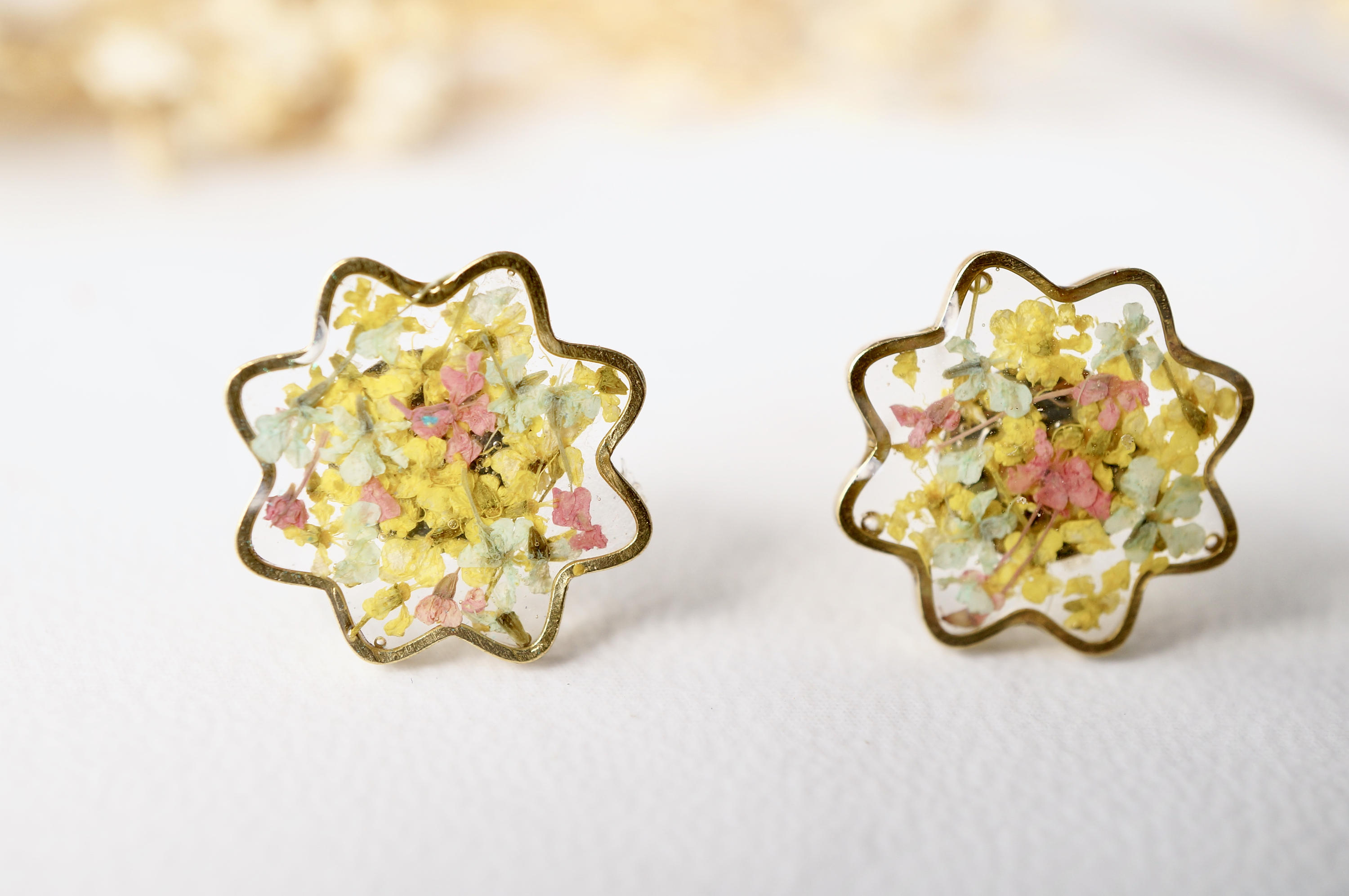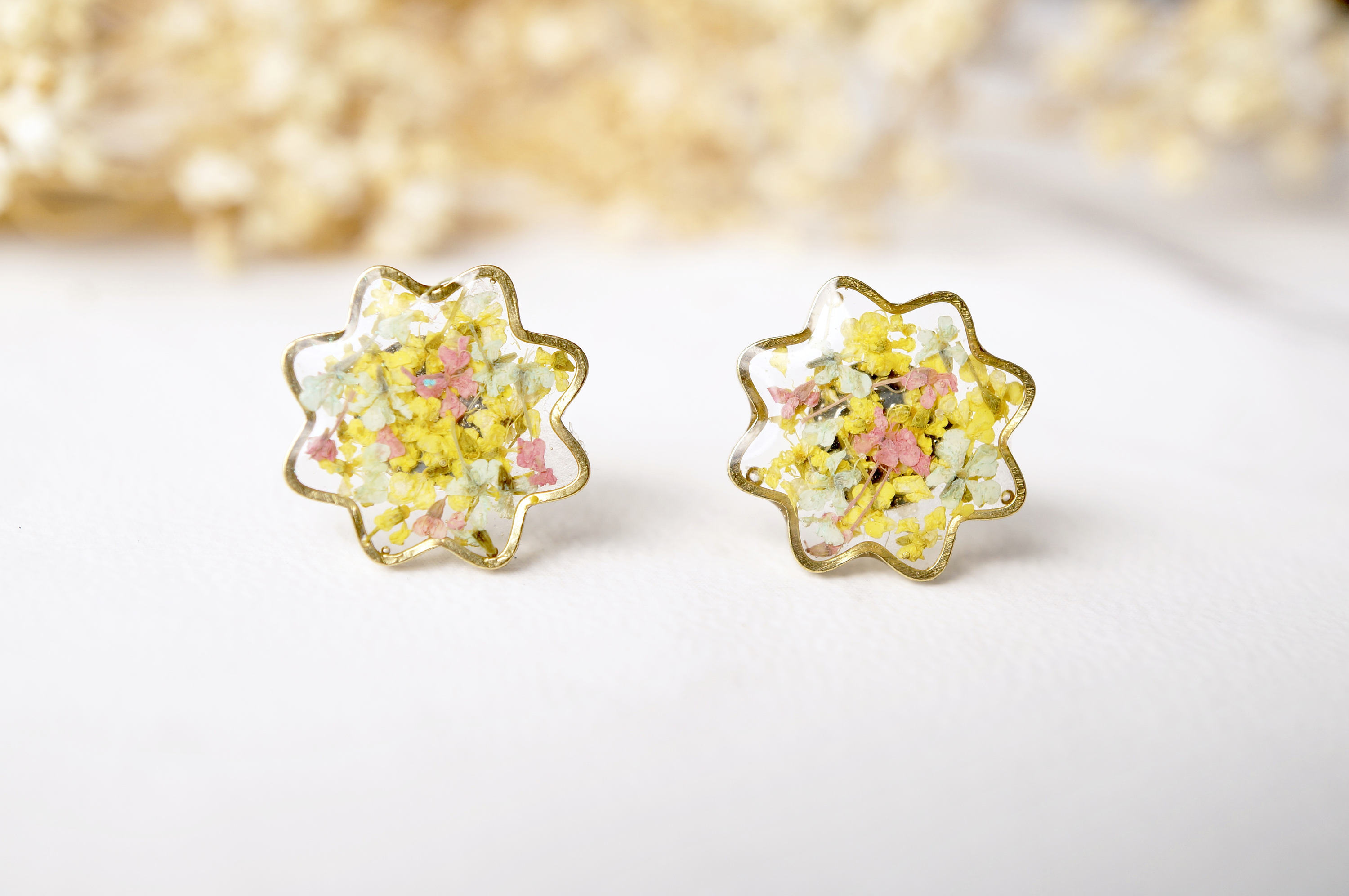 Real Dried Flowers and Resin Flower Stud Earrings in Yellow Mint Pink