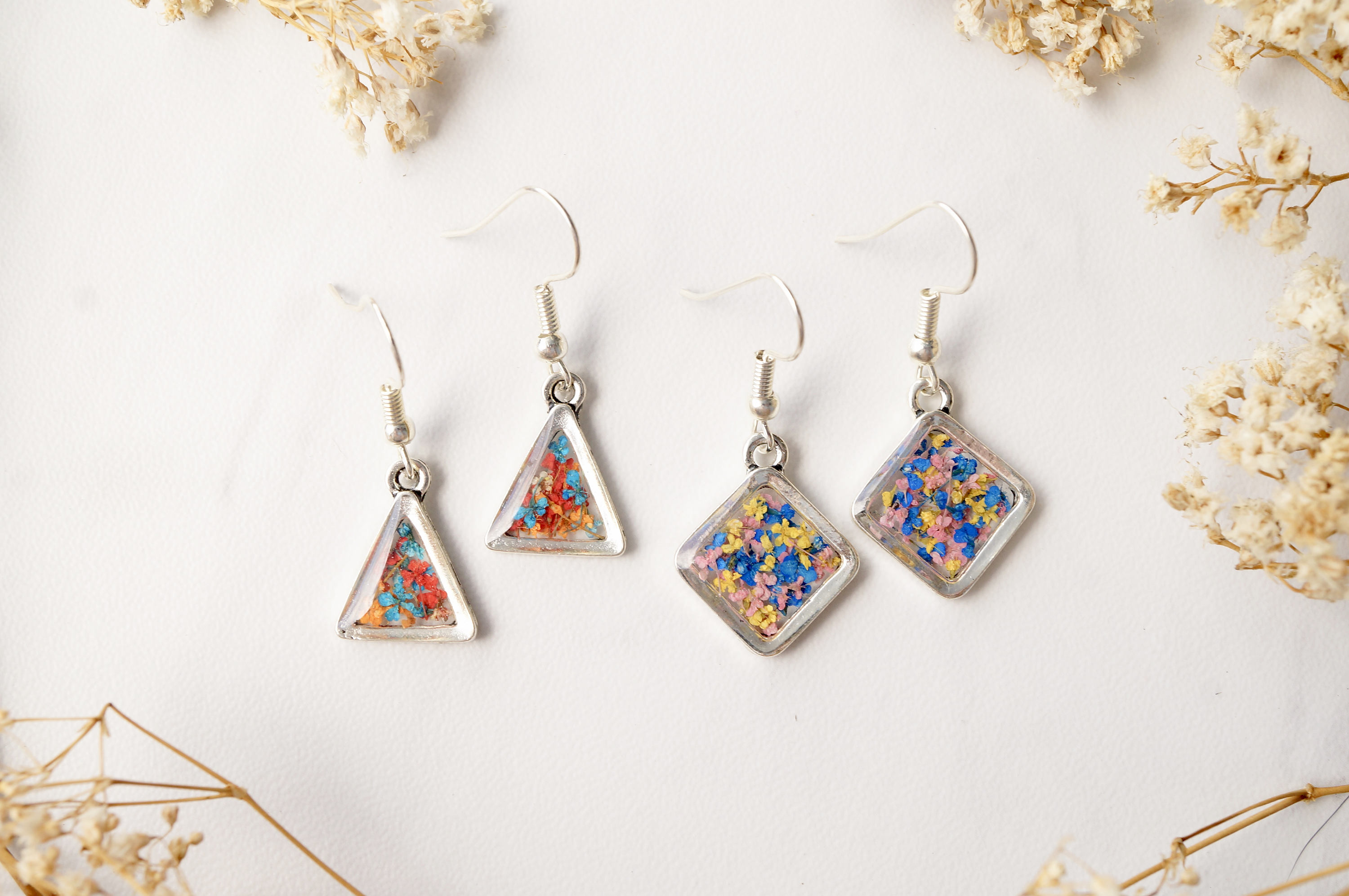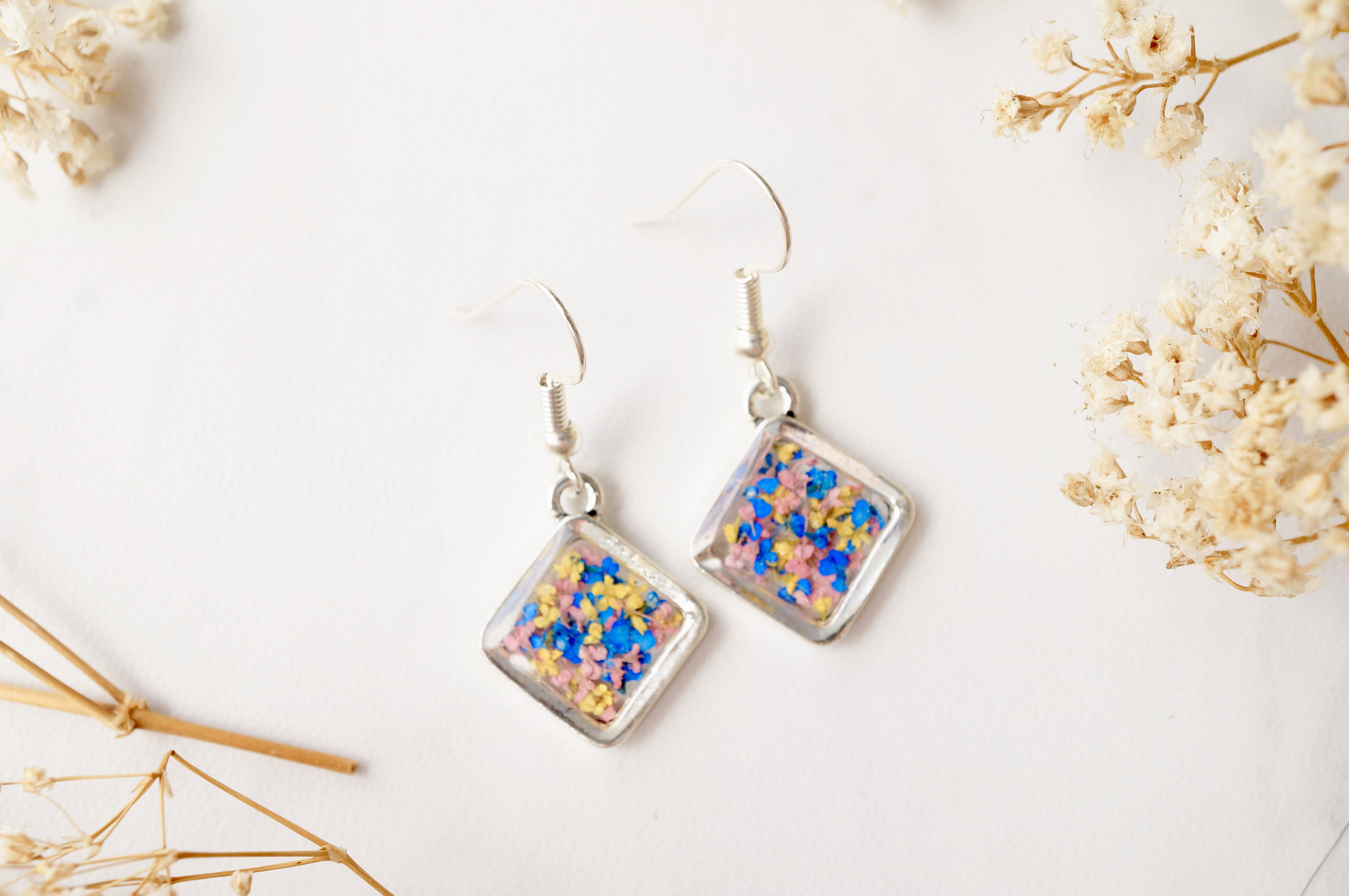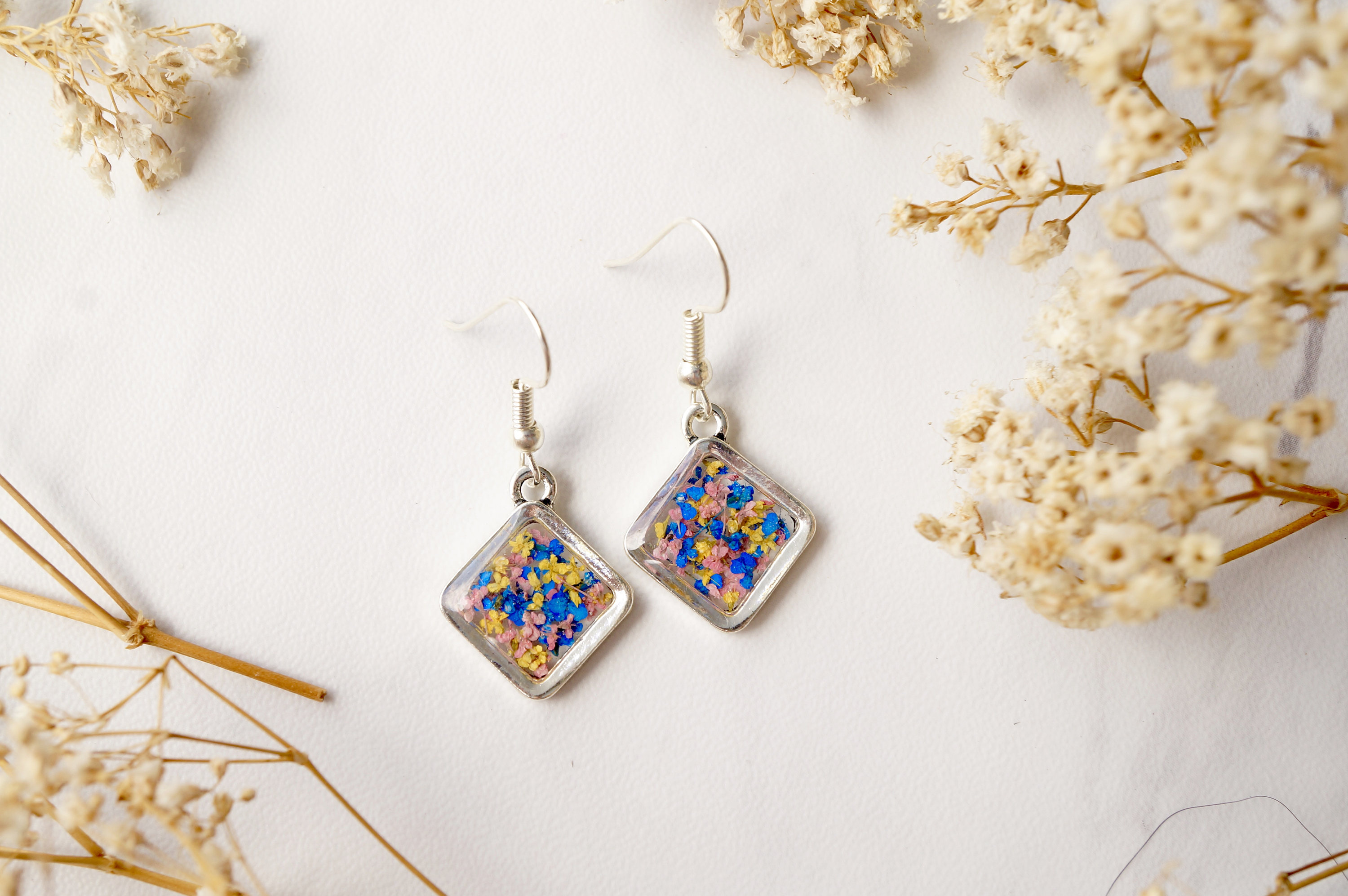 Real Dried Flowers and Resin Earrings, Silver Diamond Drops in Yellow Blue Pink