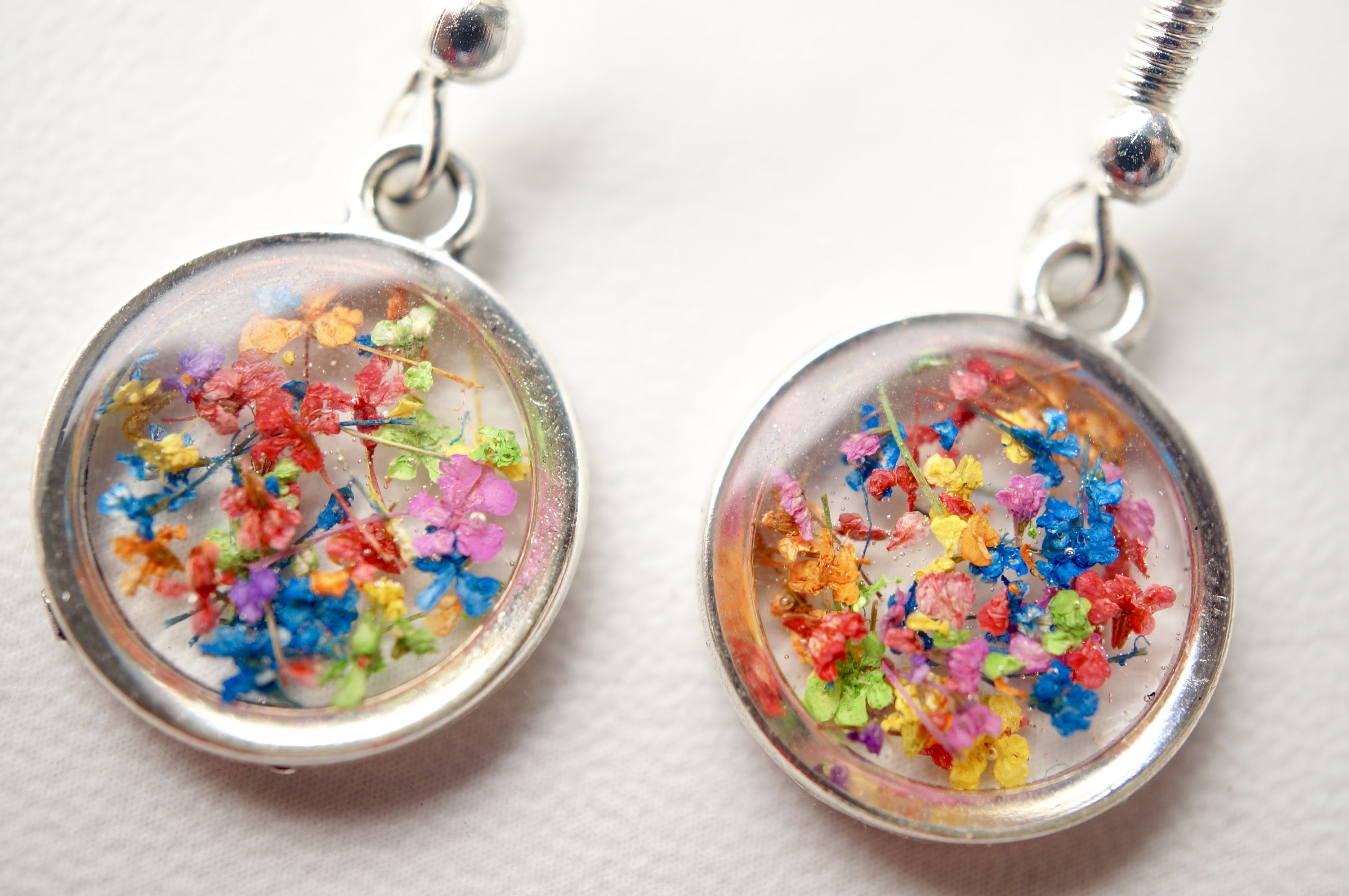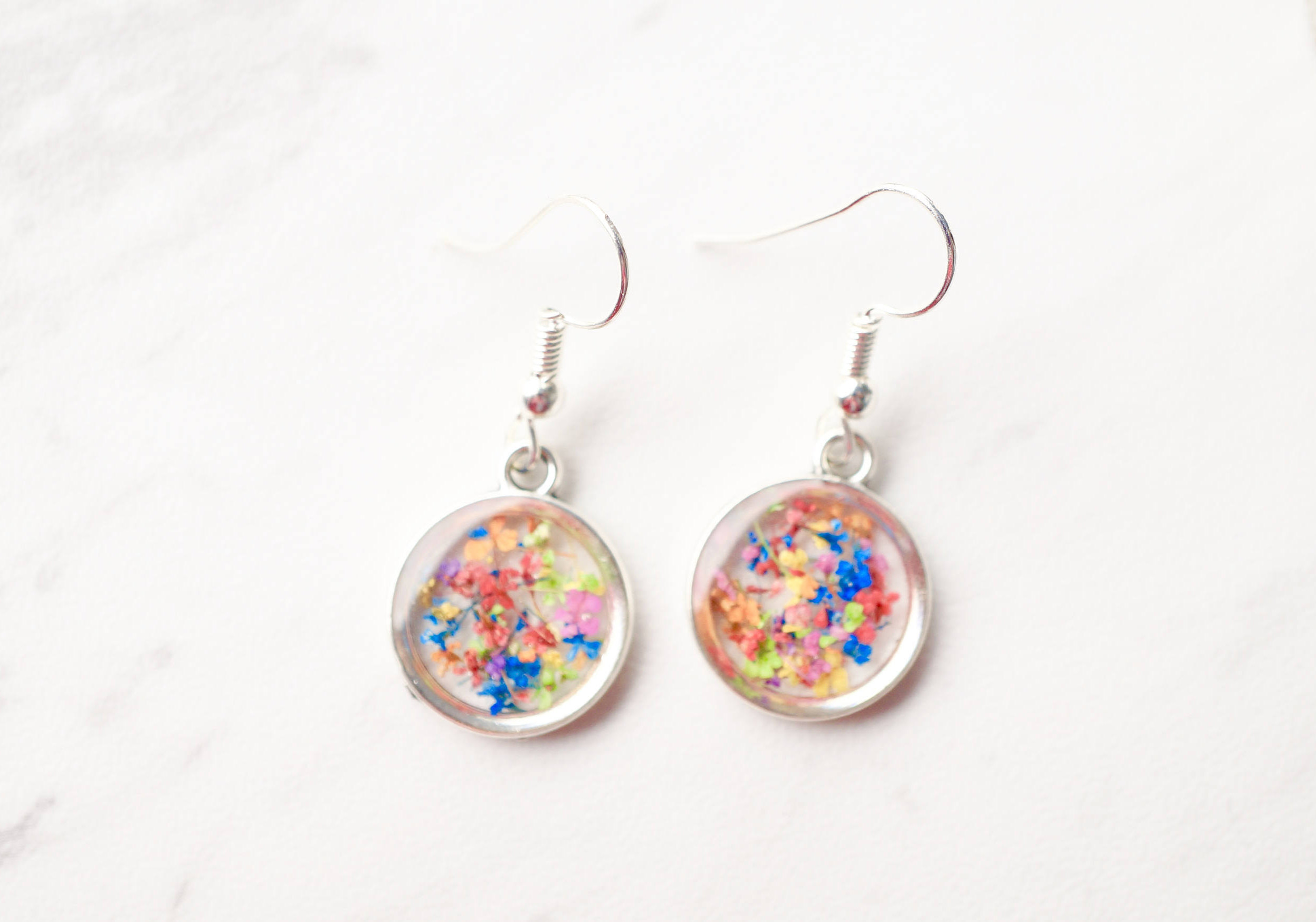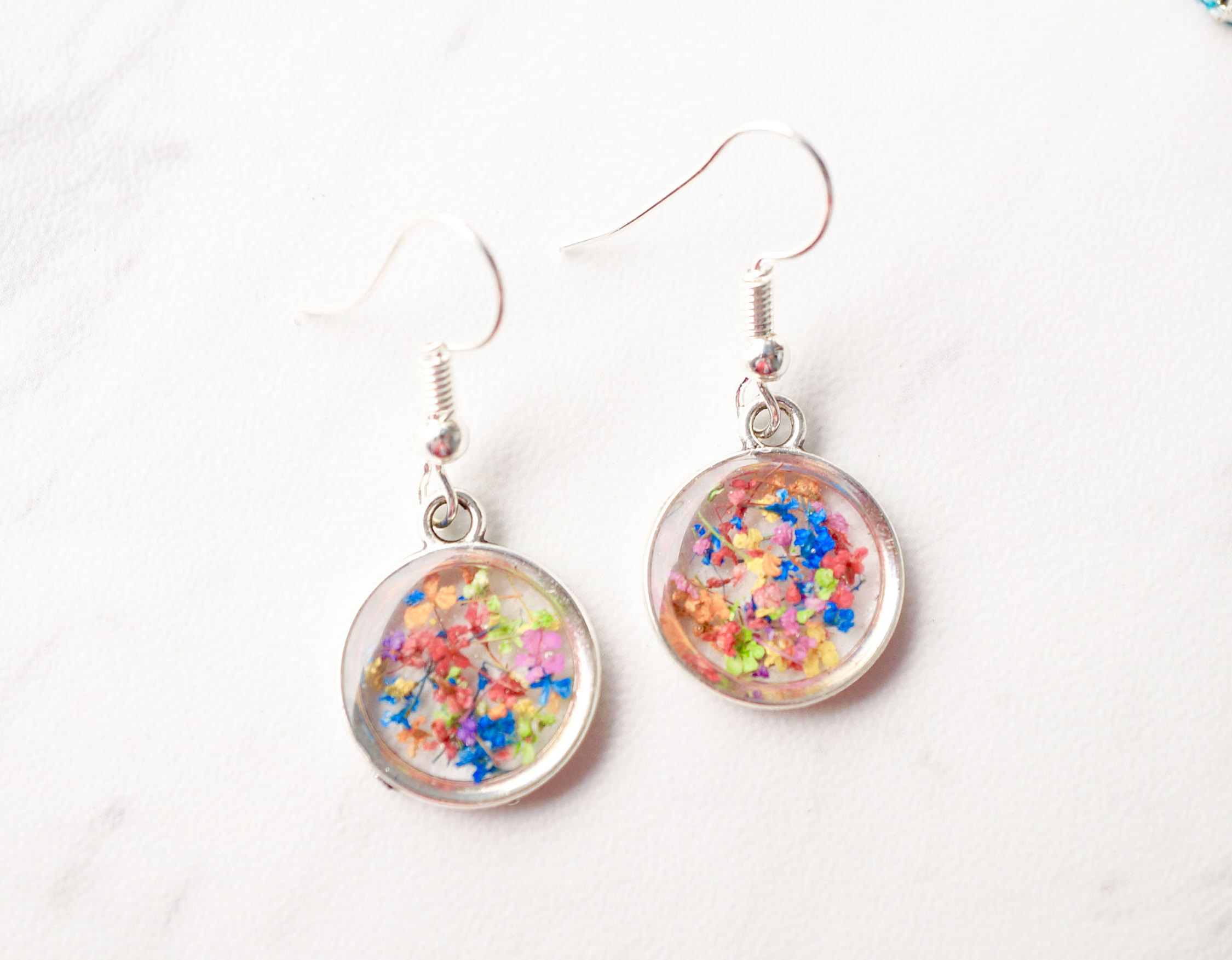 Real Dried Flowers and Resin Earrings, Silver Circle Drops in Party Mix