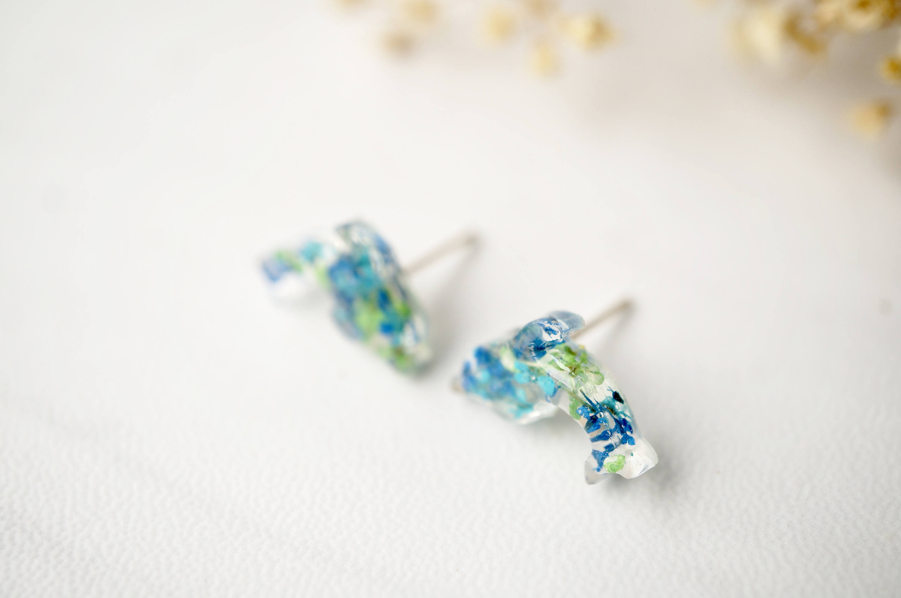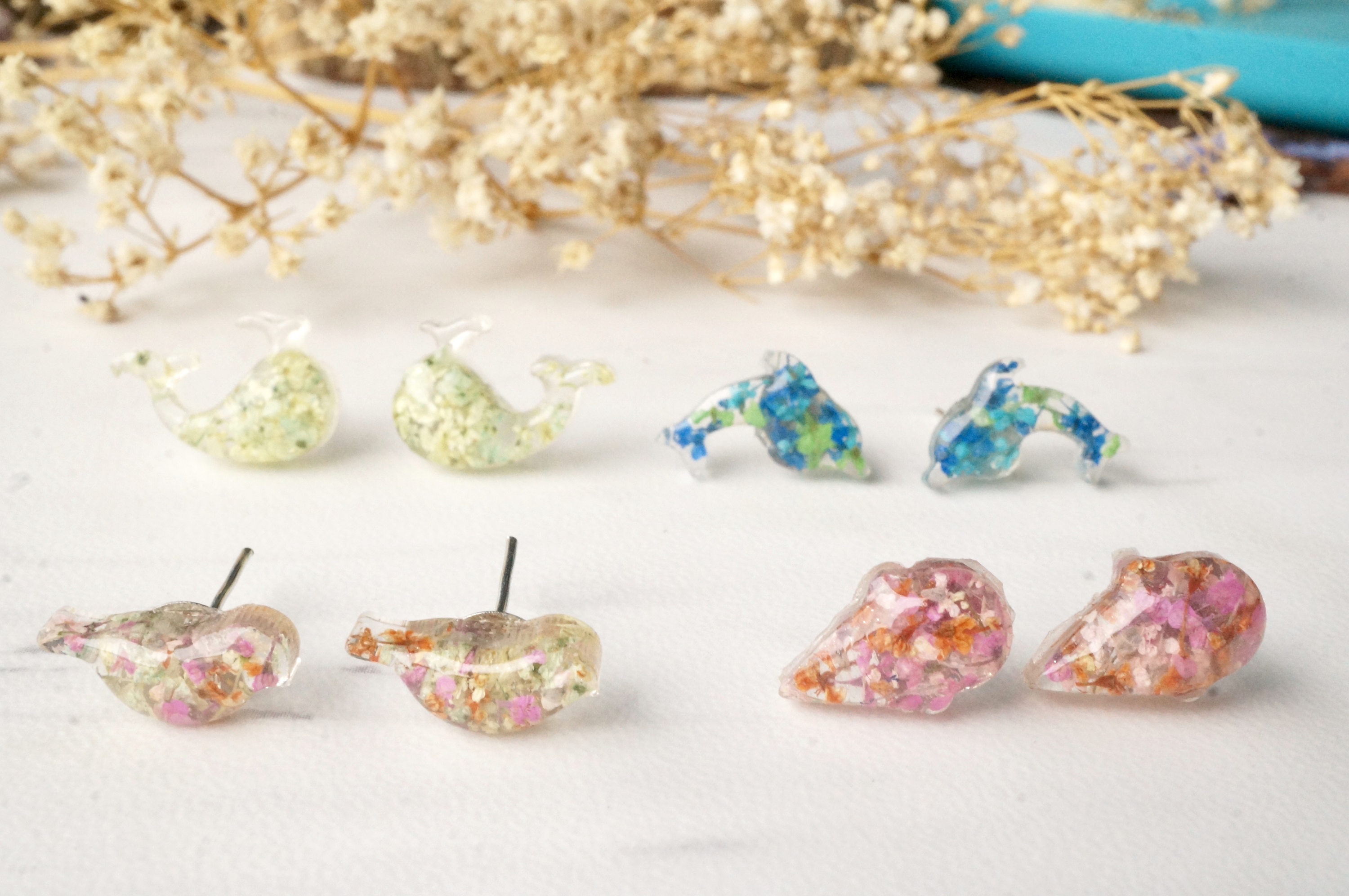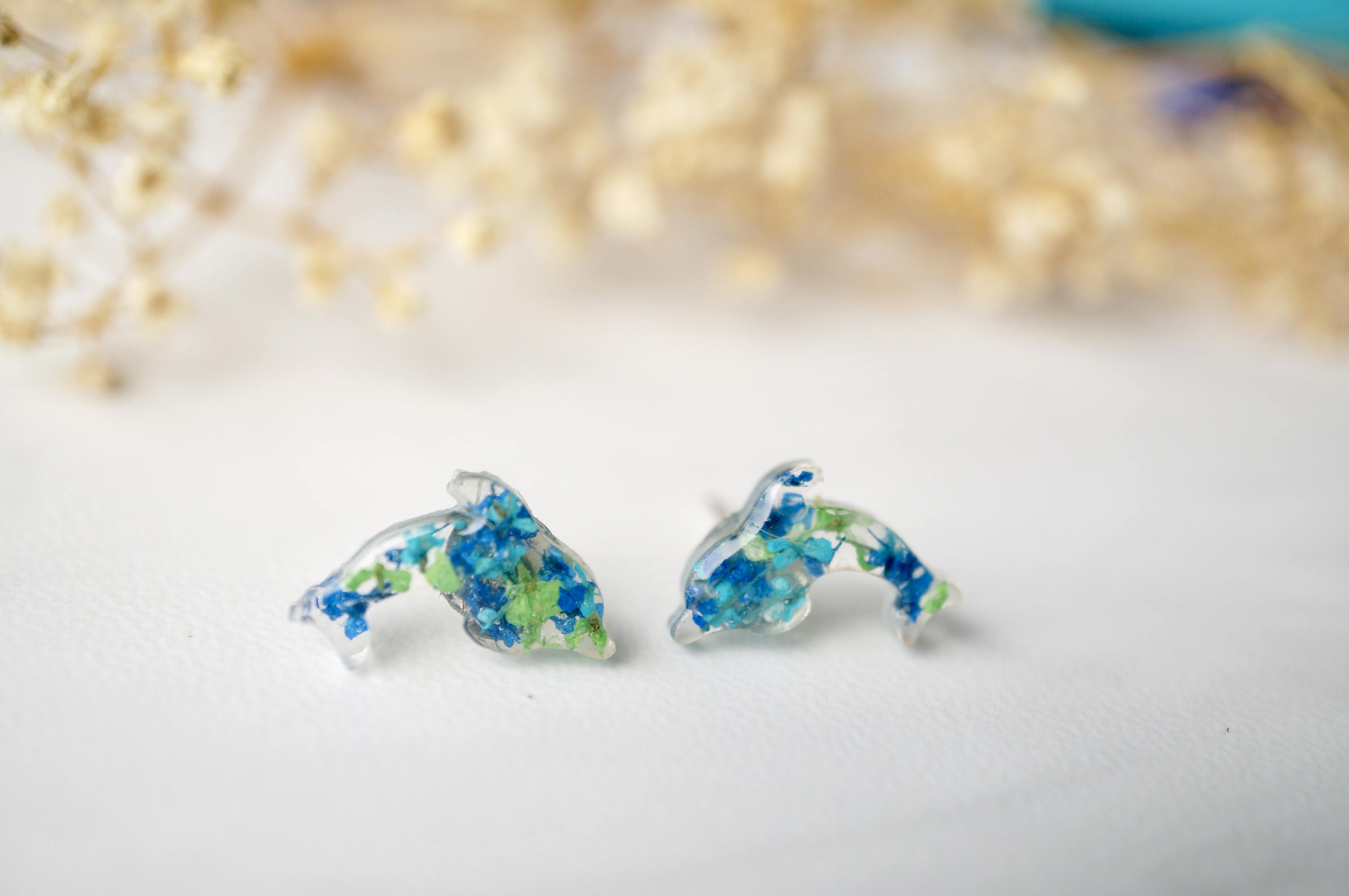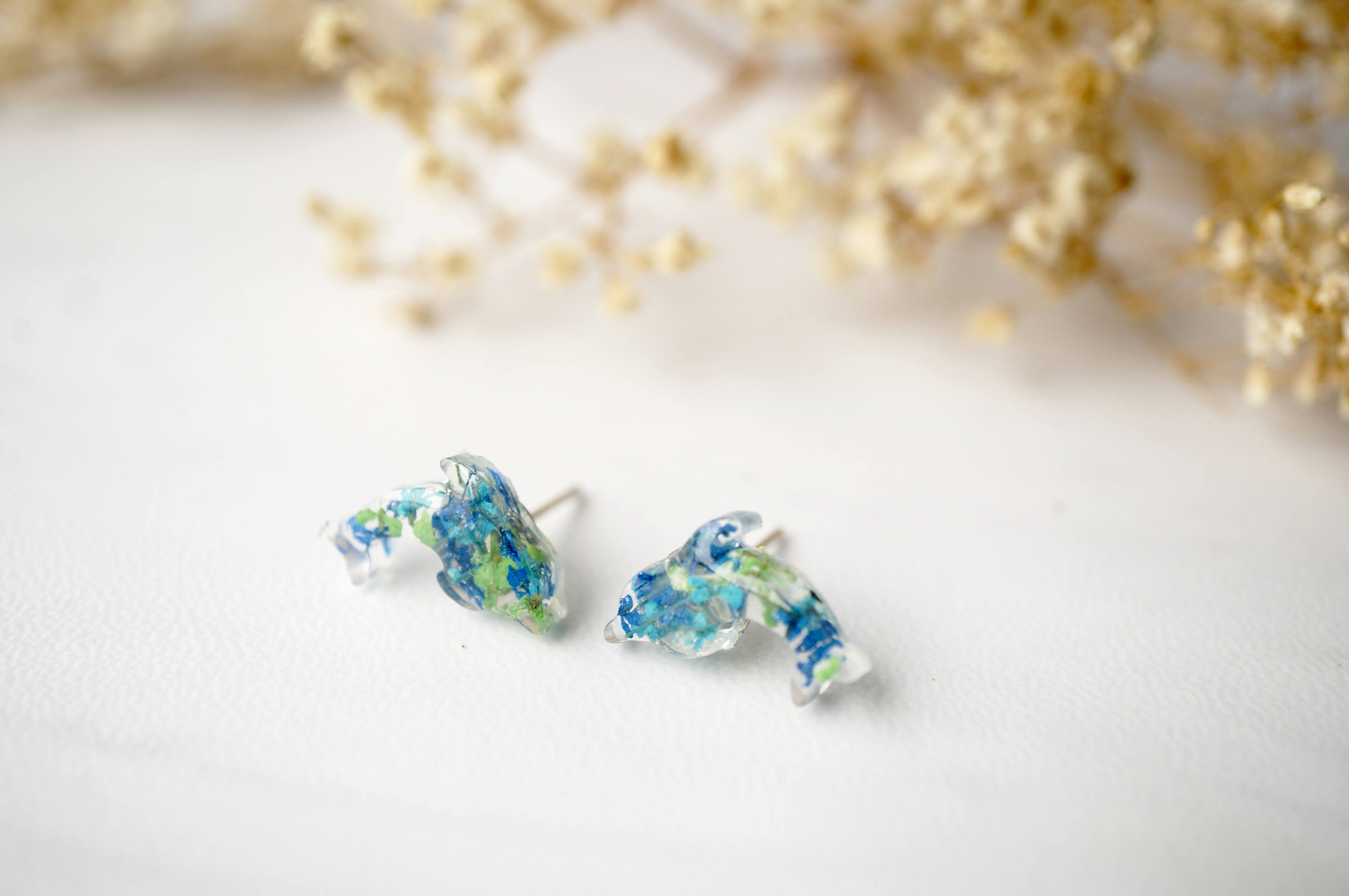Real Dried Flowers and Resin Dolphin Stud Earrings in Greens and Blues