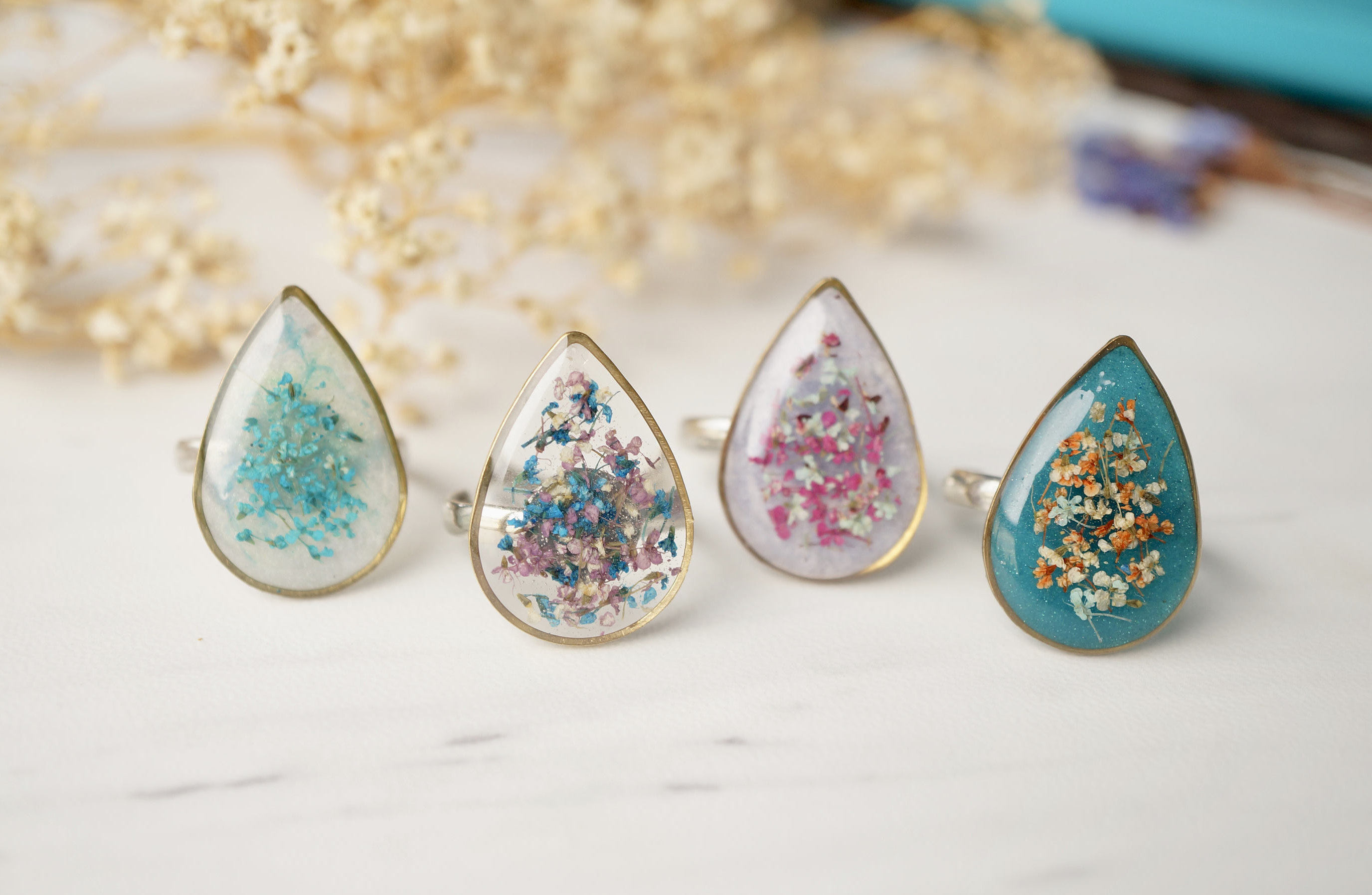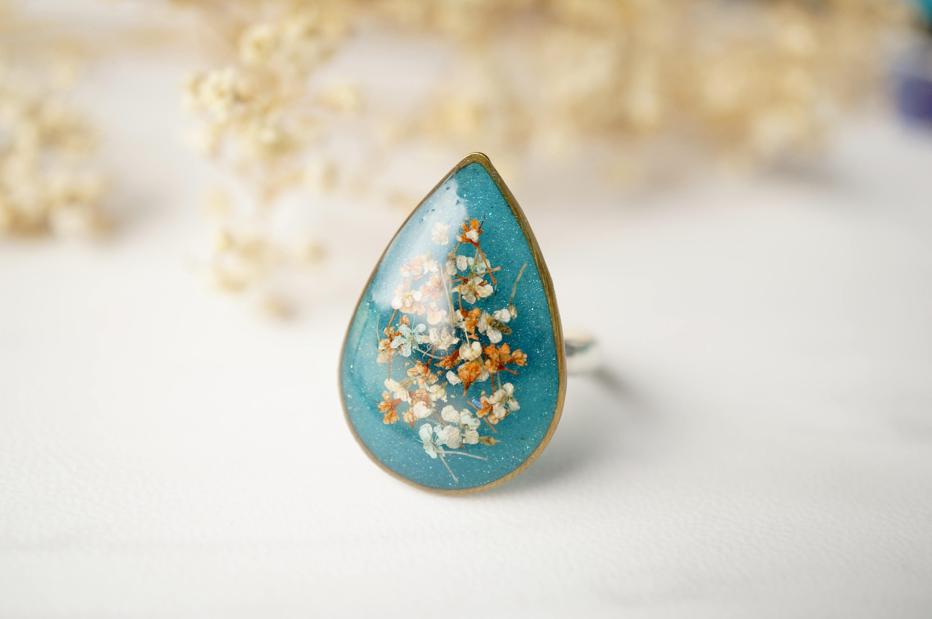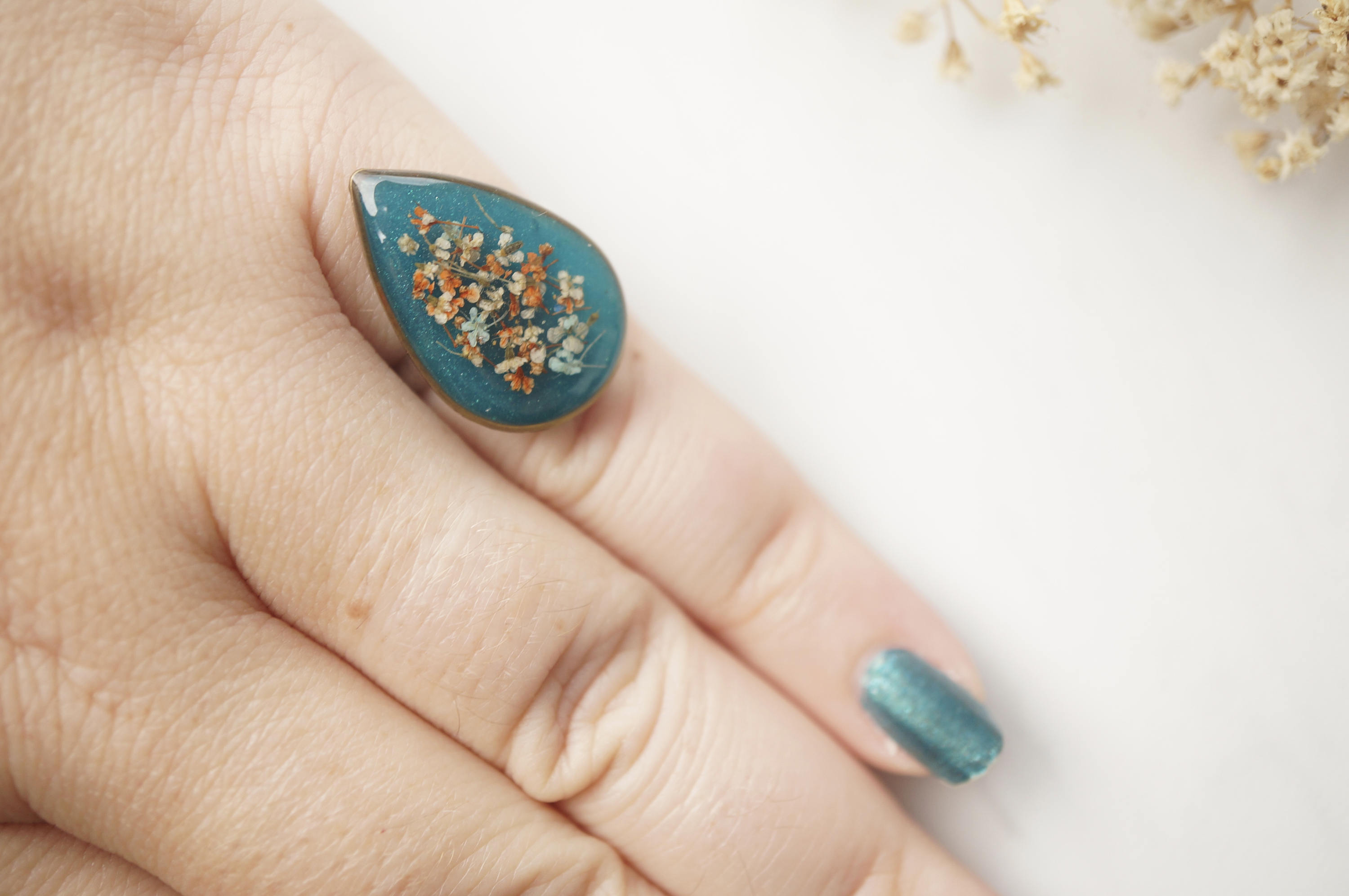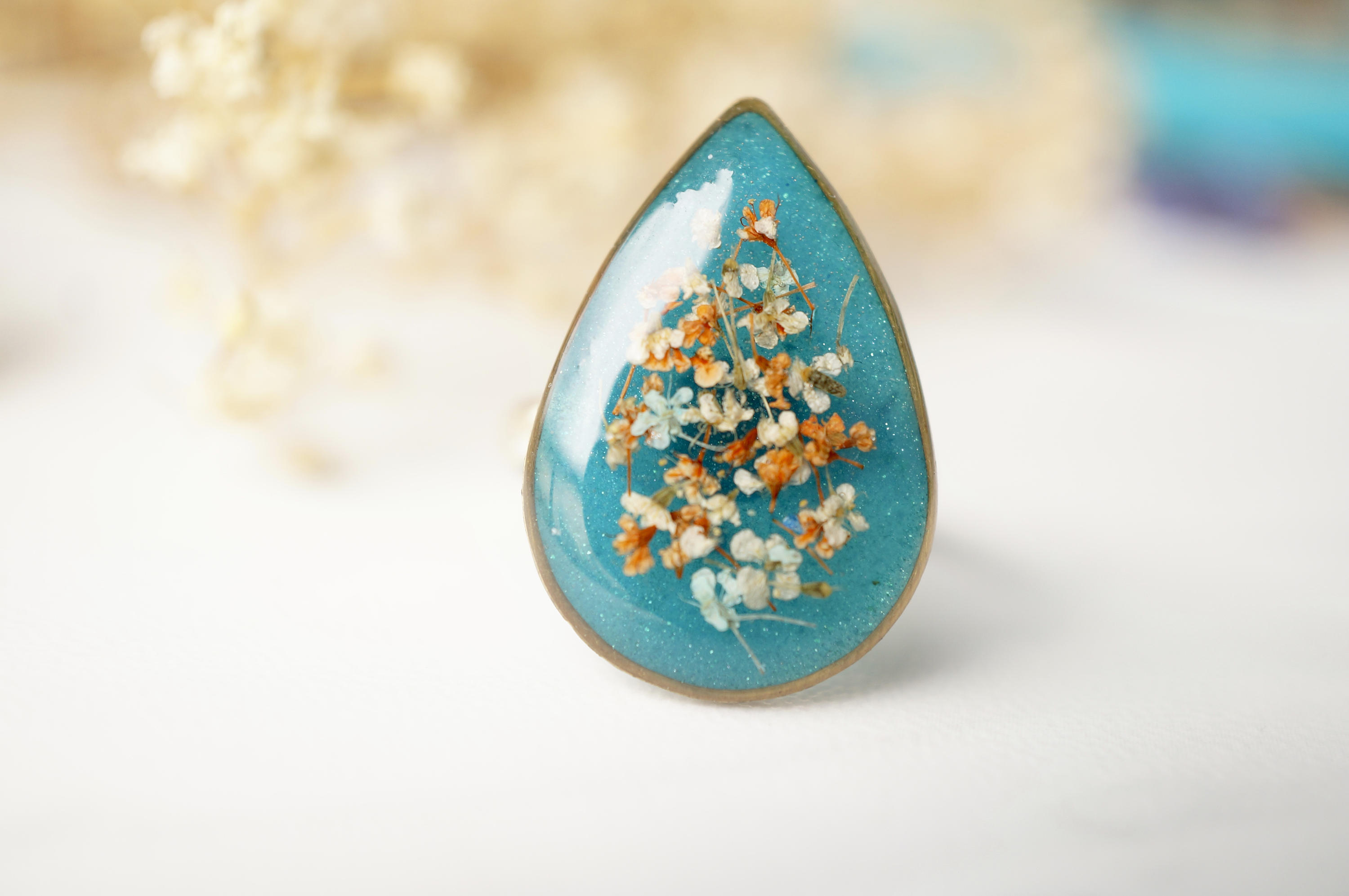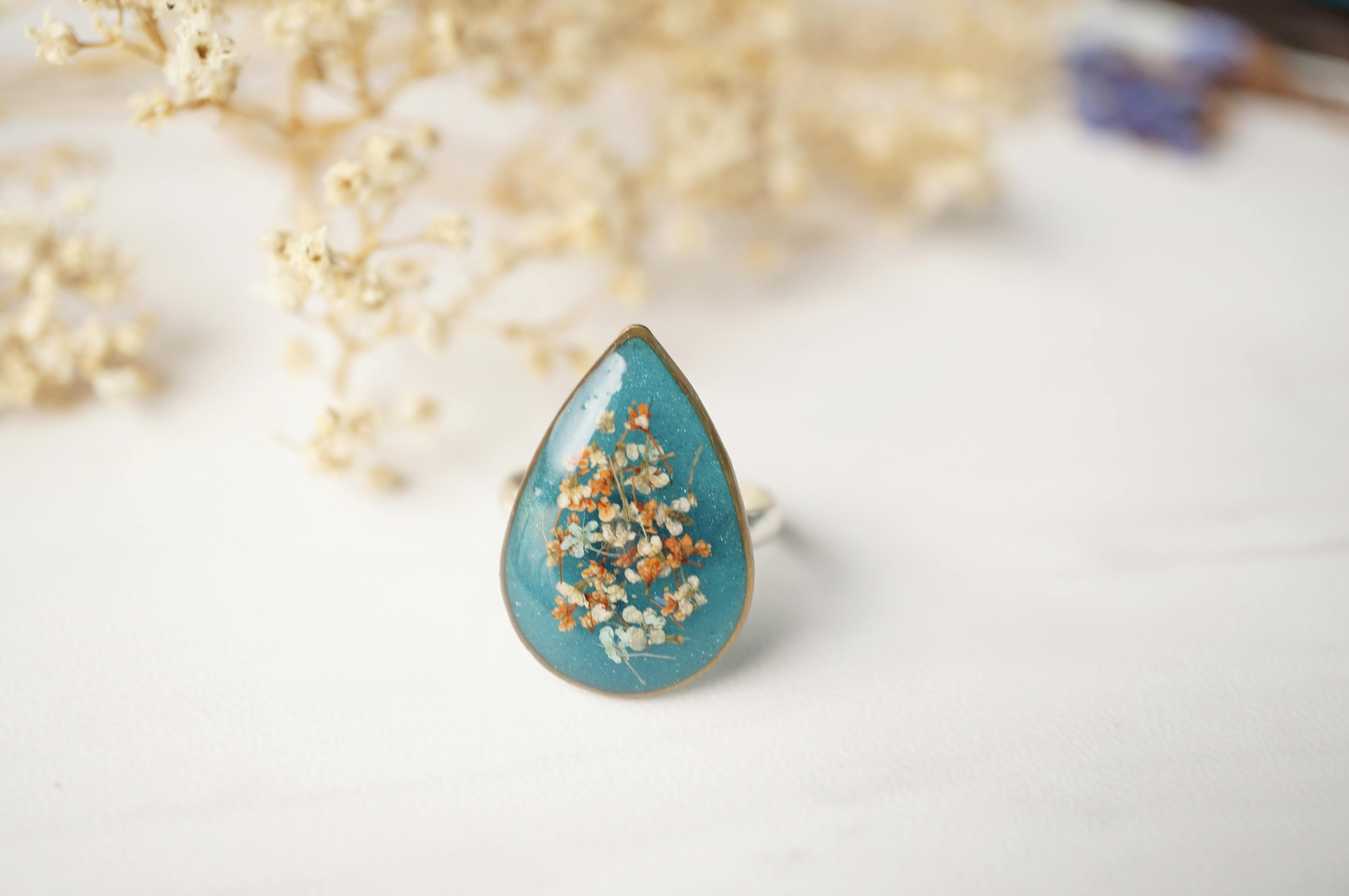 Real Pressed Flower and Resin Ring in Gold, Teal Orange White and Mint